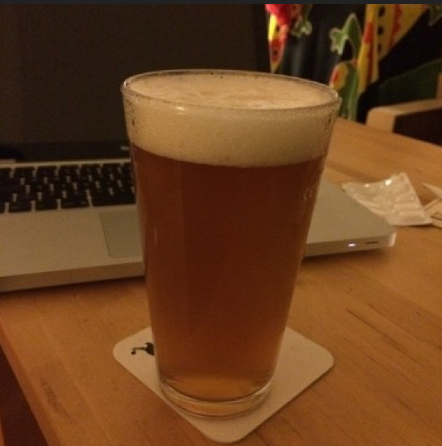 Mein eigenes IPA, gestopft mit 10,5g/l Cascade und Chinook. Noch nicht ganz fertig gereift aber trotzdem schon gut :)