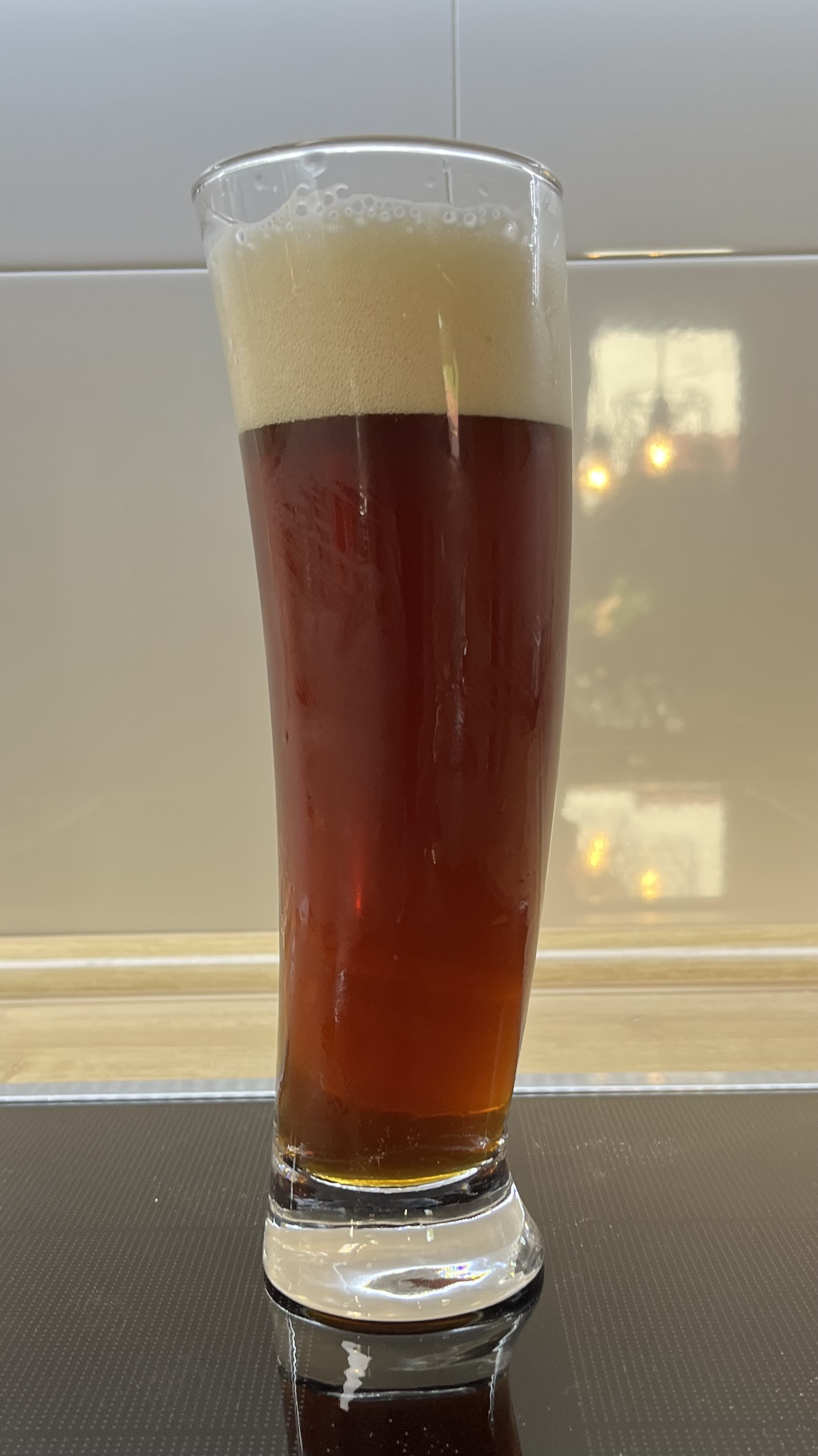 Schaum: extrem feinporig, sehr kleine, schneeweiße Perlen. Hält lang, legt sich dann als Deckel komplett über die Oberfläche. Ringe haften am Glas schließlich nach jedem Schluck.