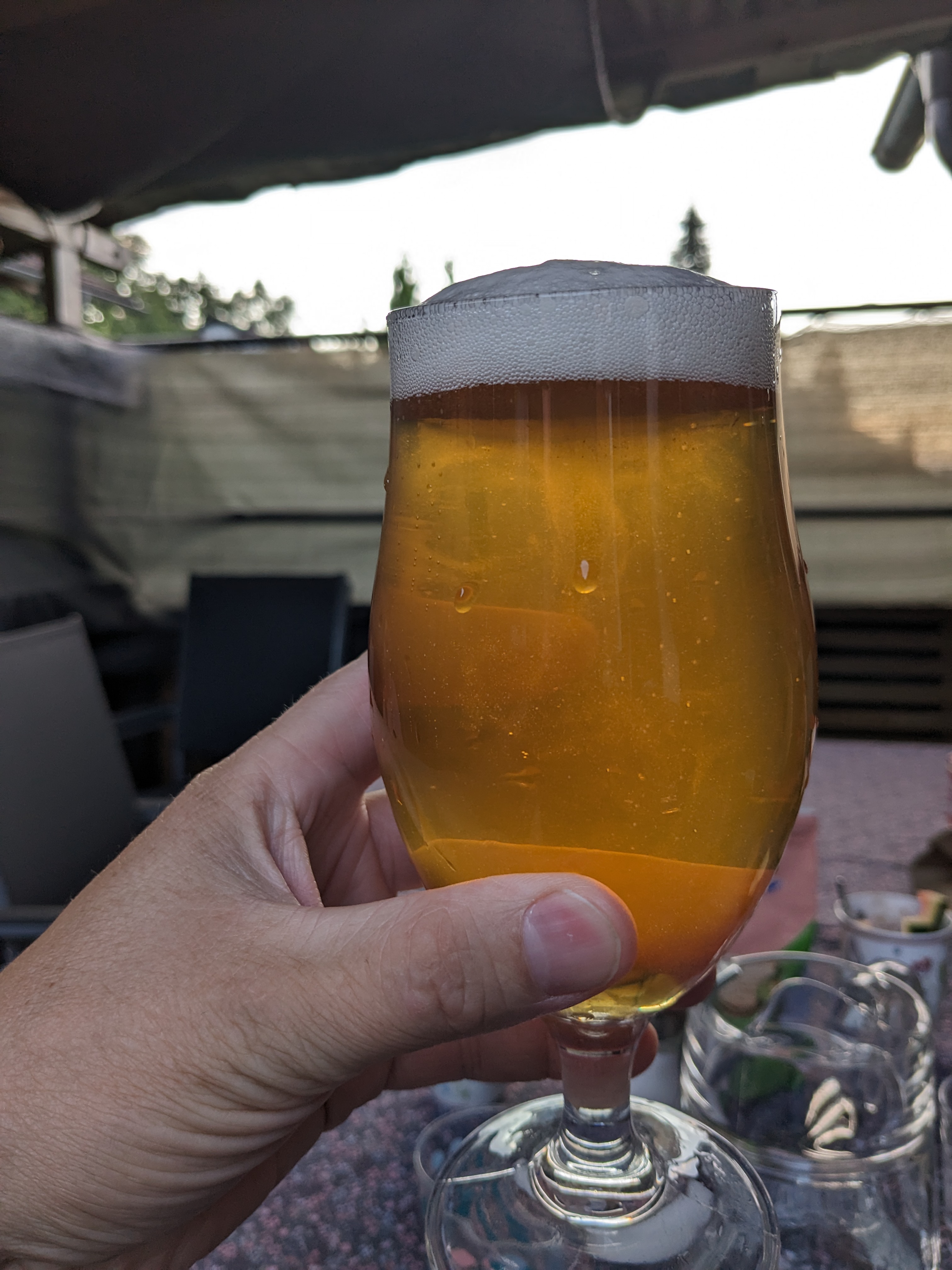 Ein Bio-Dinkel-Weiße direkt vor der tollen Kulisse der Aldersbacher Brauerei. Süffig, nicht zu mastig-malzig-süß, kein Schleimgefühl vom Dinkel. Toll gemacht!