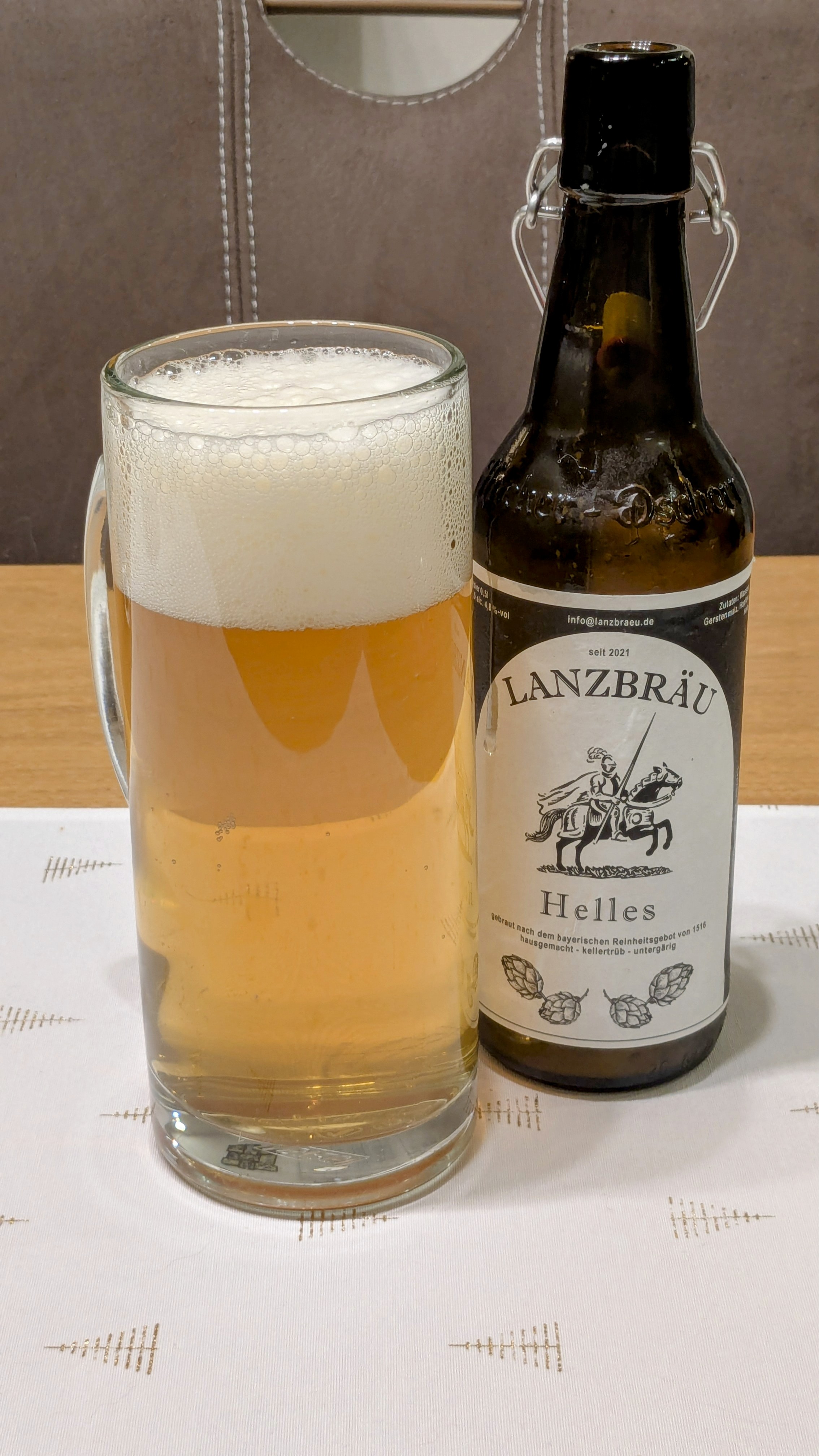 Ein "Helles" von meinem Braukumpel LANZBRÄU. Mit PiMa und Pale Ale Malz. Gebittert mit Tradition und Saazer. Hefe ist die S-23 im Einsatz gewesen. Tolle goldgelbe Farbe. Beständiger Schaum und sehr klar. Kein Bodensatz im der Flasche. Da macht sich der Unterschied zur Flaschengärung eben bemerkbar.