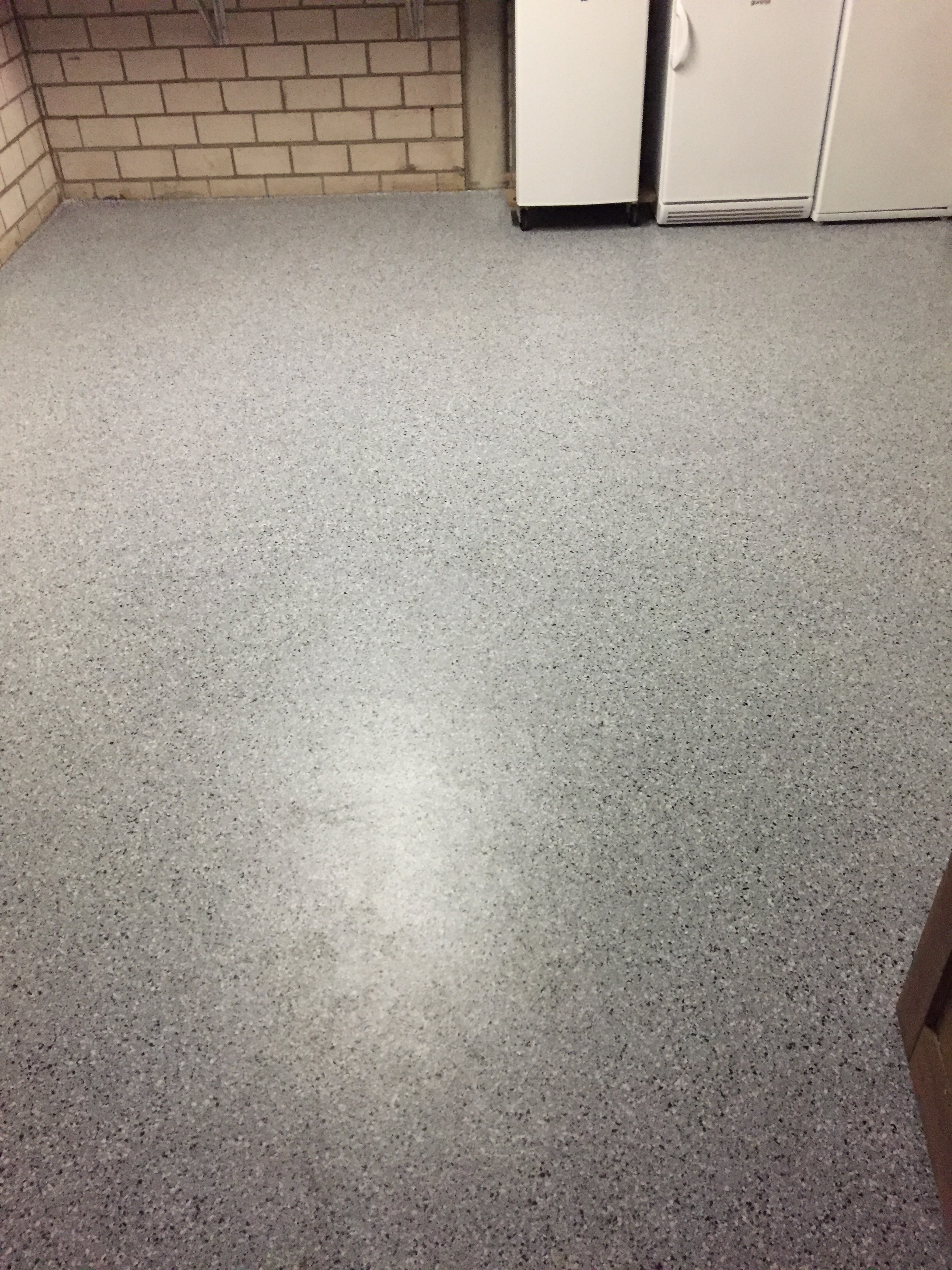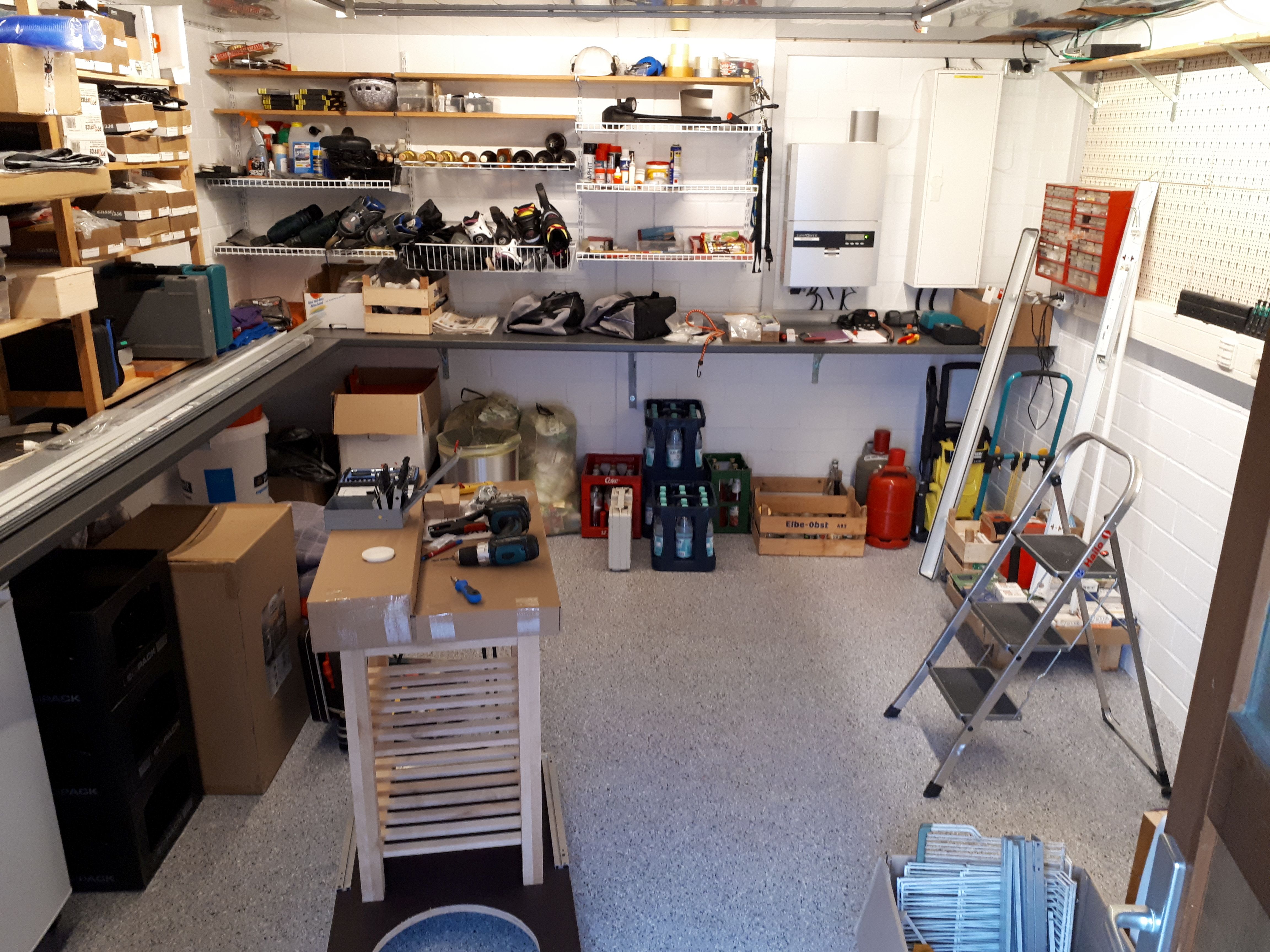 Der Boden war noch ein Zement-Esterich Boden und wurde mit einem Industrieboden aus dem Lebensmittelbereich vergossen. Der Boden ist extrem belastbar und zeigt selbst nach "Rutschpartien" mit schweren Gegenständen keine Kratzer auf.
