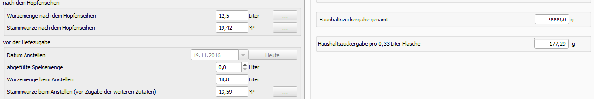 Beim letzten Sud habe ich mir die Volumina der Würze vor und nach dem Kochen notiert. Zudem sagte mit der kbh, dass ich etwa 1,5L verdünnen müsse, um auf die Zielstammwürze zu kommen. Die Volumenangaben vor und nach dem Kochen habe ich in den Verdampfungsziffer-Rechner gegeben und es kam etwa 20% dabei raus. Nach der Änderung von 10 auf 20% hatte sich nun der Wert "Volumen Pfannevoll bei 99°C" von 14 auf 15,5L erhöht. Sonst nichts. Was mich wundert ist, dass die Hauptguss- und Nachgussmenge unverändert geblieben sind. Ich hätte damit gerechnet, dass die Menge an Brauwasser sich um die 1,5L erhöhen müsse.