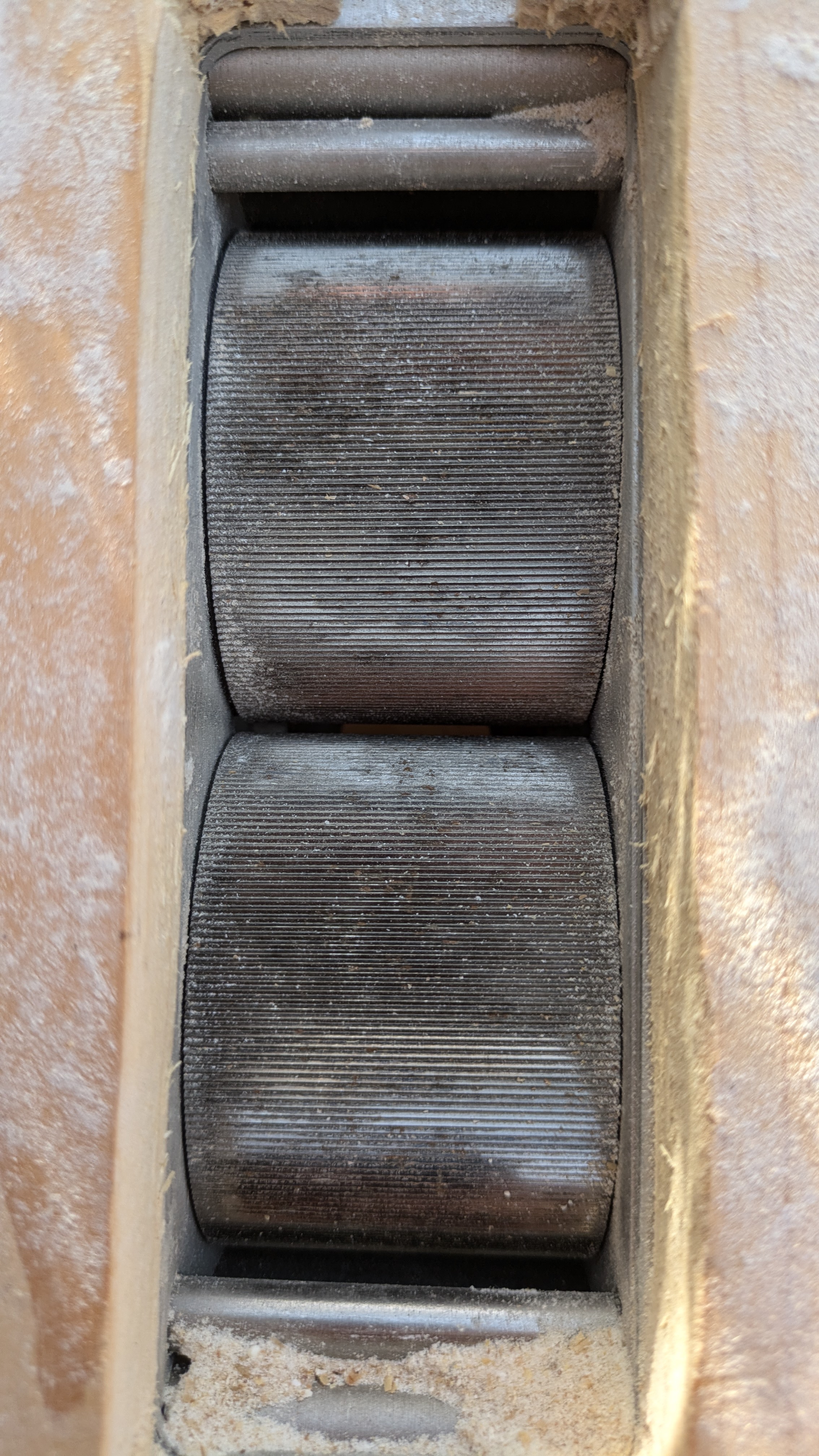 Meine spontane Idee: Stelle den Walzenabstand erstmal mal größer und dreh mit ordentlich Kraft 'ne Ladung möglichst hartes Malz wie Weizenmalz durch.