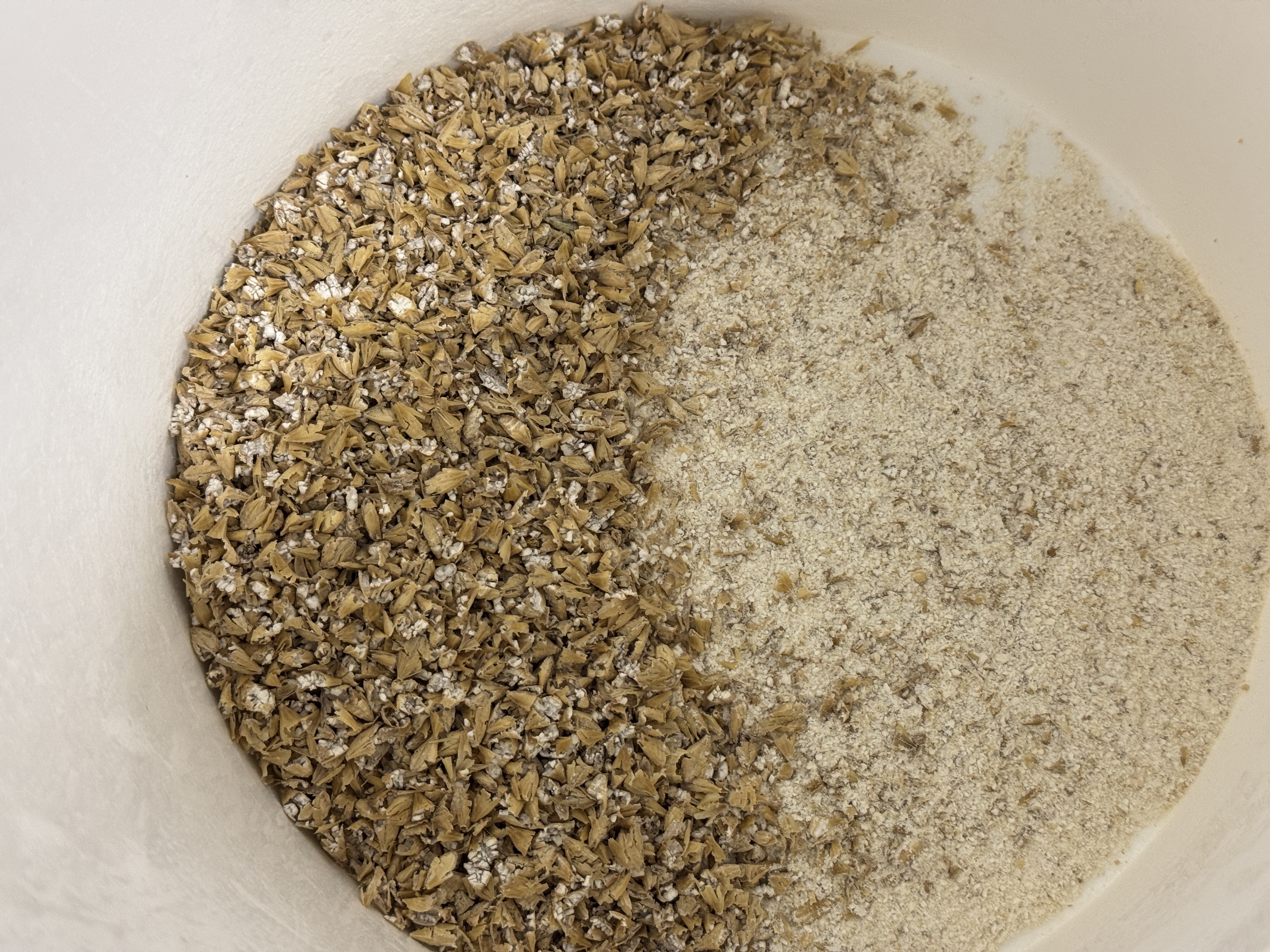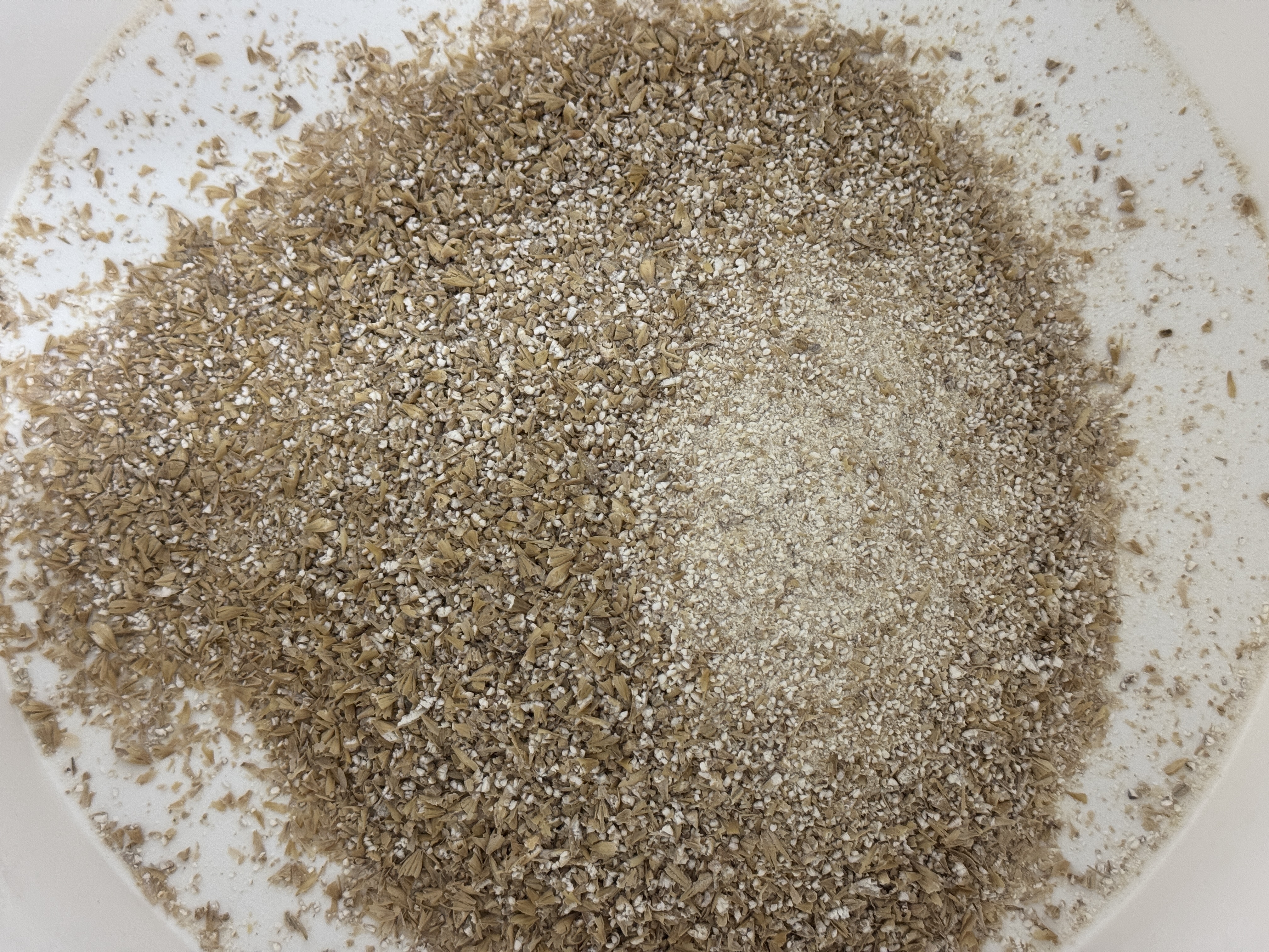 Das konditionierte 1,2mm Schrot sieht schon ganz anders aus. Direkt nach dem Schroten etwas seltsam, da viele Körner Abdrücke von der Walze zeigen und den Mehlkörper noch enthalten. Nach dem Durchmischen zeigt sich meiner Meinung nach aber ein sehr schönes Bild mit intakten Spelzen und zermahlenen Mehlkörnern.