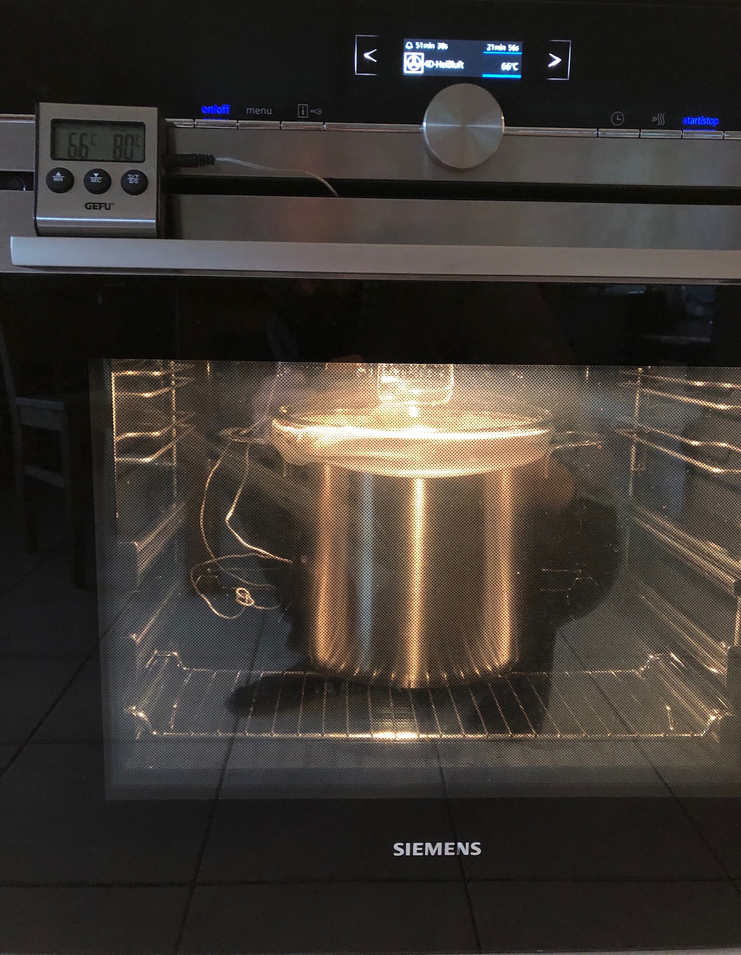 Hat super funktioniert, auf dem Herd aufgeheizt, eingemaischt, 1,5h in den Backofen bei 66°, fertig.