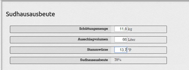Gemäss kleiner Brauhelfer resultierten 65.7% Sudhausausbeute. Wobei: Ich hatte nach dem Hopfenkochen 23L Würze und diese habe ich zur Berechnung verwendet (im KBH Würzmenge nach dem Kochen). Im Gärfass hatte ich nach dem Kühlen und Ablassen 20L Würze, was natürlich eine etwas andere Ausbeute ergäbe (57.5%). Die Stammwürze (20°C) betrug 13.8°P.