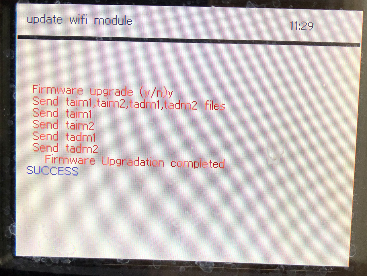 Ich habe daraufhin das Update mit einem Windows 7 Rechner wiederholt und da lief das Update des WiFI-Moduls fehlerfrei durch. Beim Neustart des BM kam aber wieder dieses terminalartige Fenster. Nach der Meldung "SUCCESS" muss man dann den BM erneut vom Stromnetz nehmen und wieder mit dem Rechner verbinden und dann Netzstecker rein und BM Software-Update durchführen. Jetzt verbindet er sich bei mir auch wieder mit dem W-Lan. :thumbup