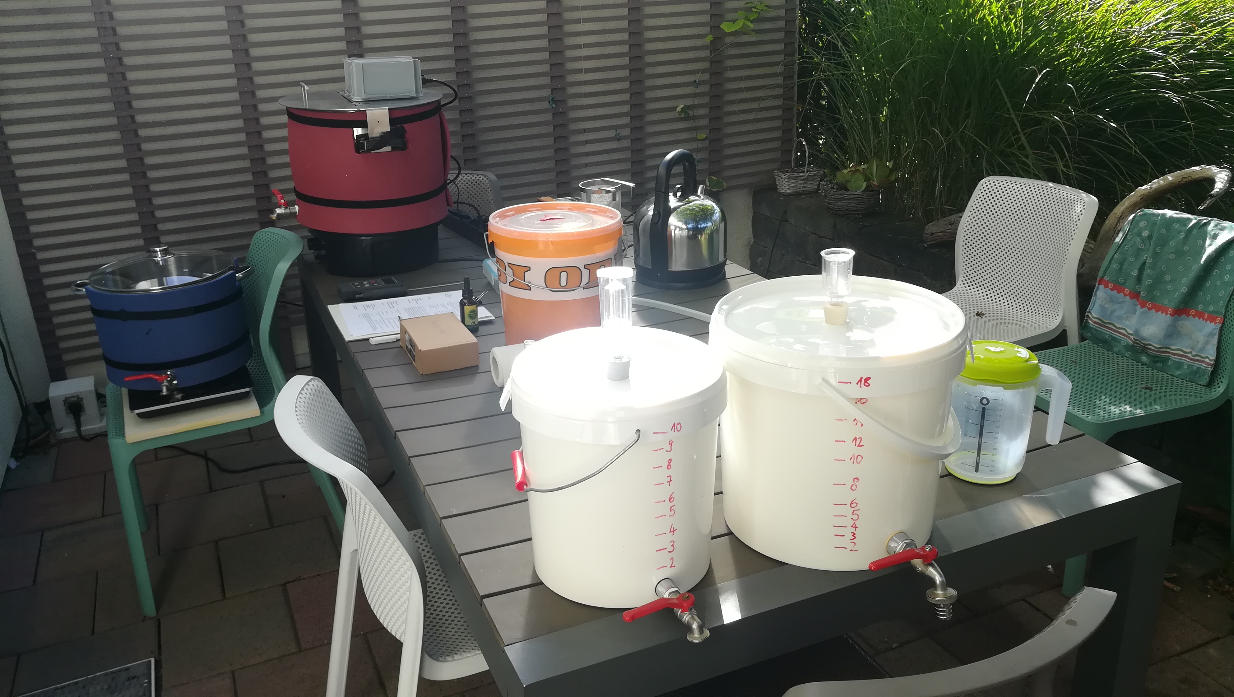 Der Brautag ist zu Ende und knappe 40 Liter Würze mit 8°P sind in zwei verschiedenen Gäreimern. Einmal Simcoe/Amarillo mit 40 IBU und der zweite Teil mit Lemondrop und Callista wird ein Milkshake IPA mit Maracuja.