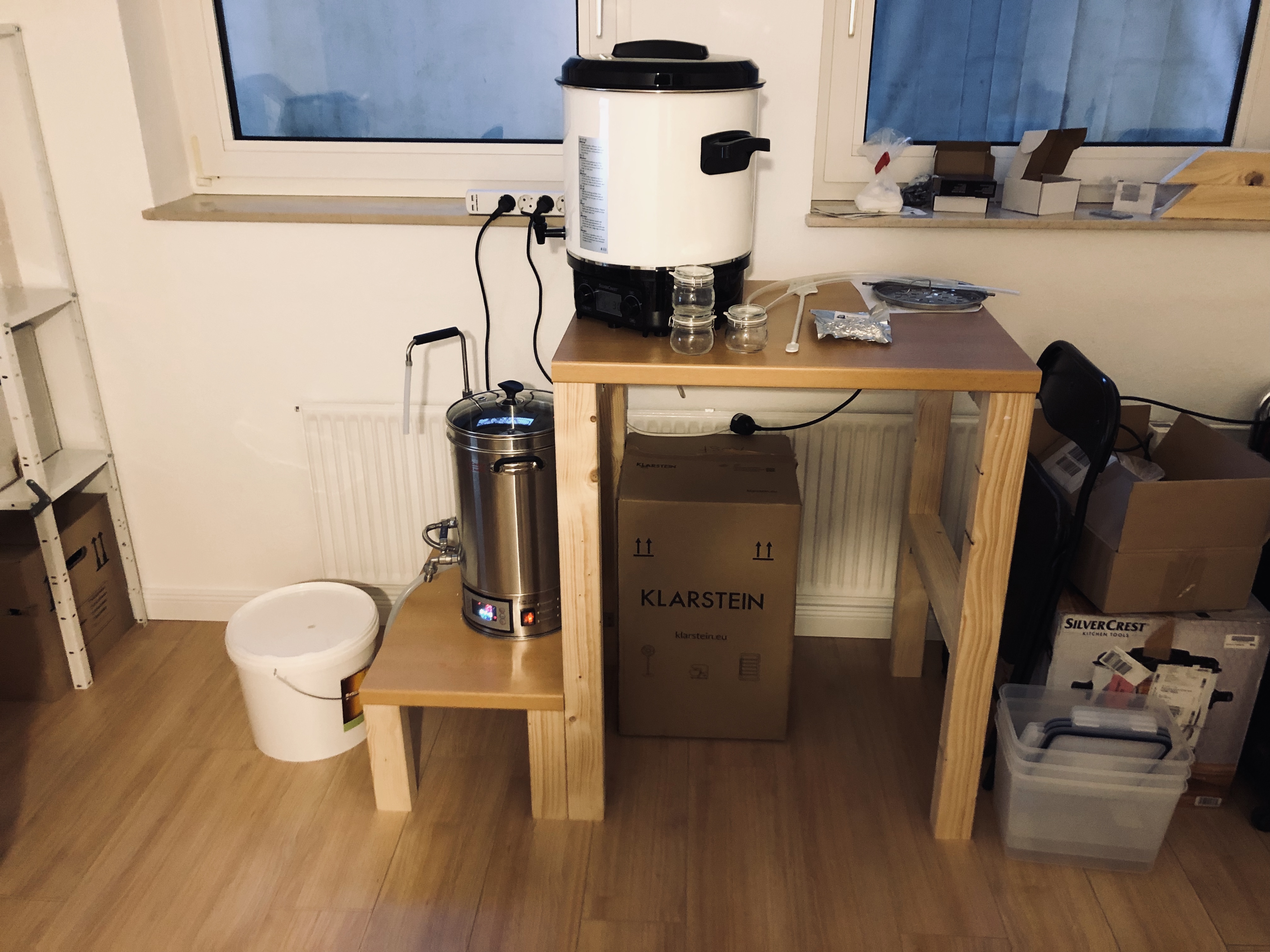 Ich braue derzeit mit dem Brauheld 15 und habe mir nach meinem Umzug im neuen Keller eine kleine Ecke einrichten können. Meinen "Tisch" hab' ich gerade neu gebaut und daher wollte ich auch mal testen wie es damit so läuft: