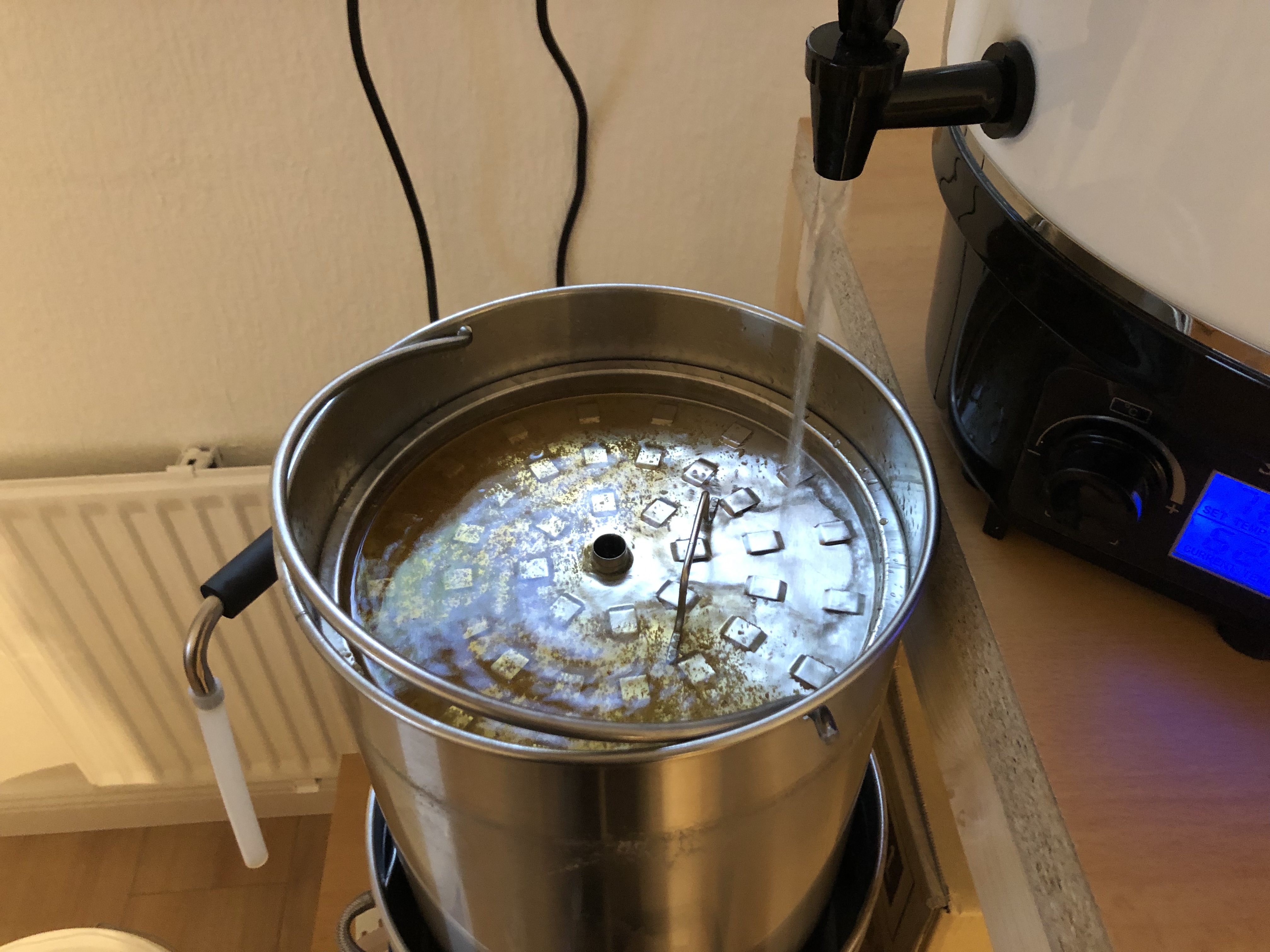 Los ging es dann ca. um 10:30 Uhr. Wasser rein, beim Warten auf die 67° dann Kaffee kochen und danach einmaischen: