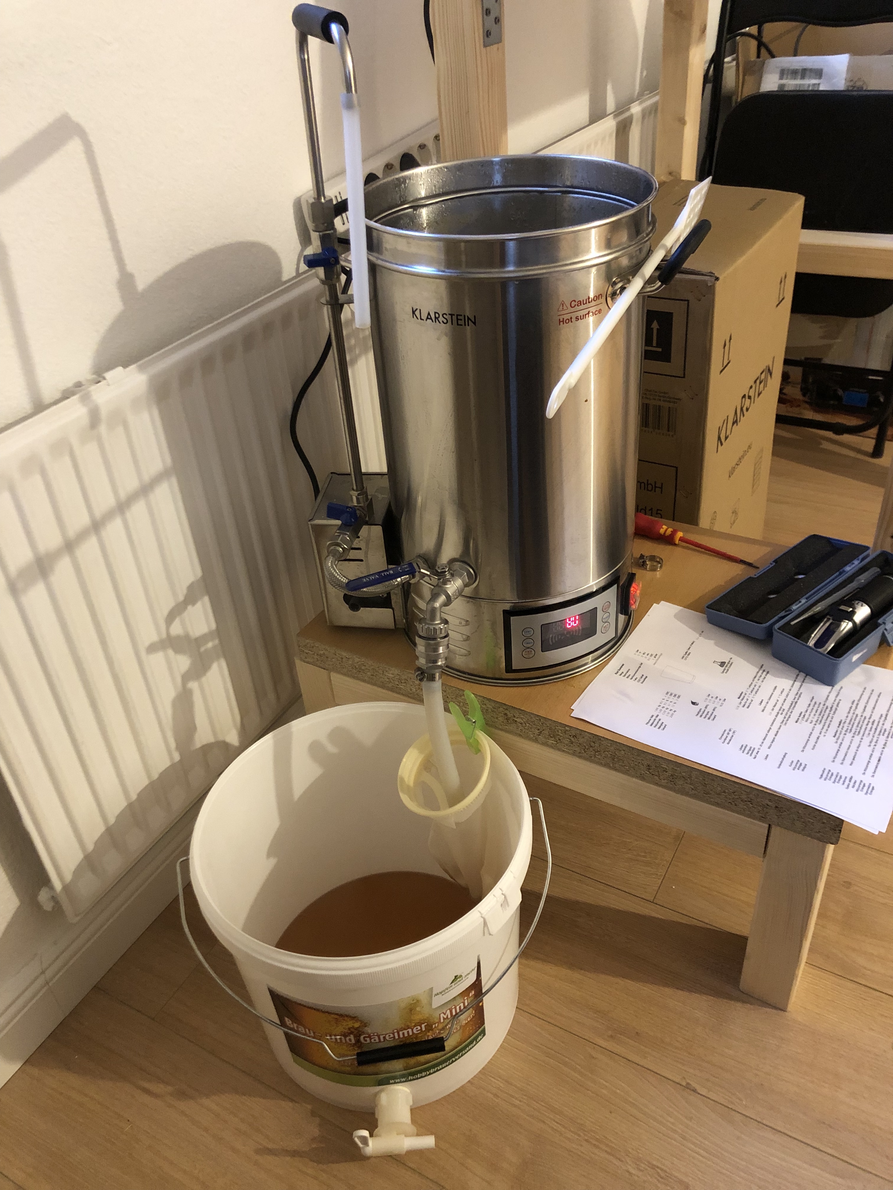 Nach dem Hopfenkochen hab' ich noch einen Whirlpool angedreht. Das Foto davon ist aber komischerweise ziemlich verschwommen, damit verschone ich euch mal lieber. Jetzt kommt der nächste Test für meinen Tisch, den er besser bestanden hat. Das Hopfenseihen: