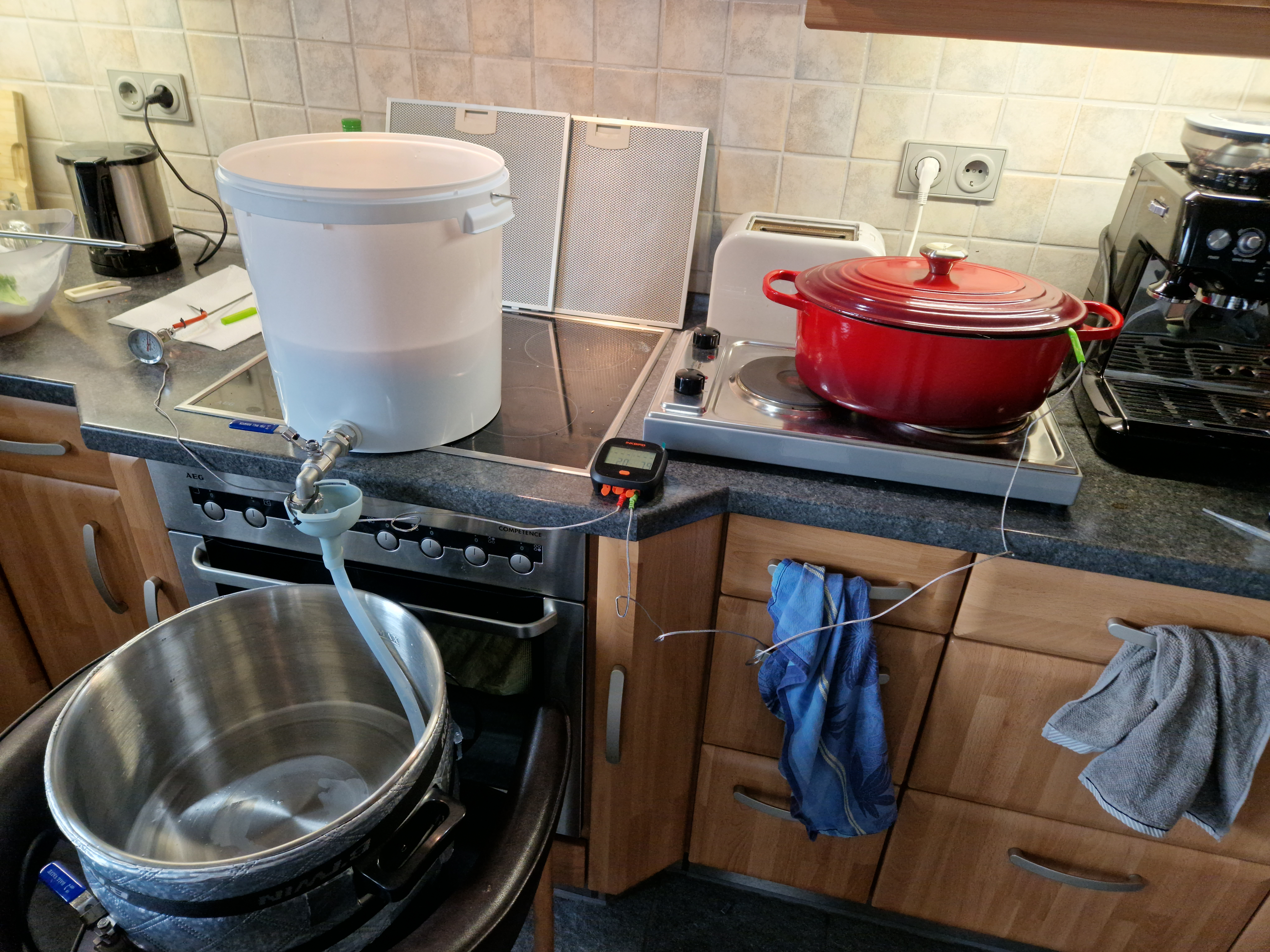 Wasser auf 66°C. Kontrolliert mit digitalem und analogem Thermometer