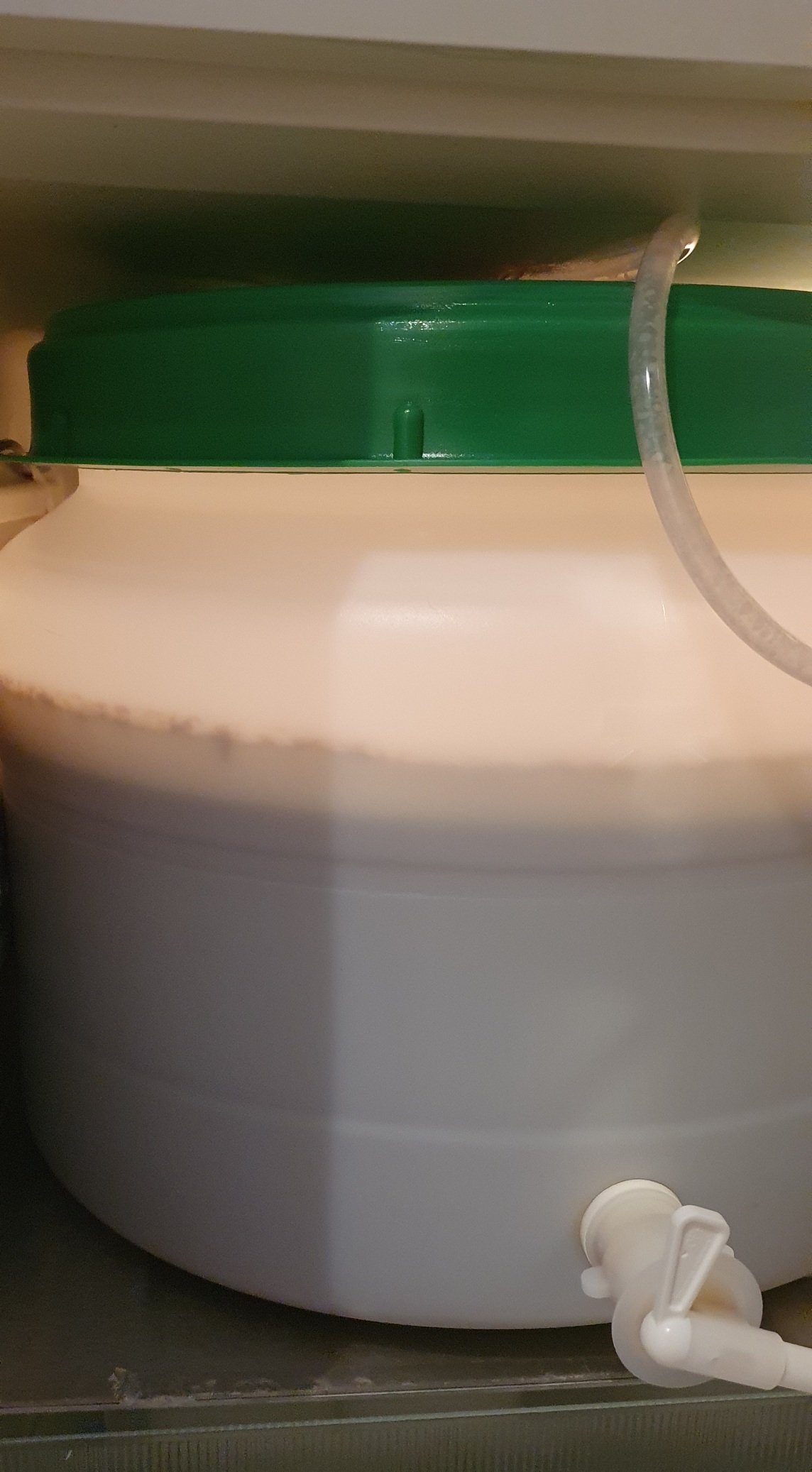 Blöderweise scheint der Deckel des Gärfasses undicht zu sein. Der Gärspund hat nicht einmal geblubbert und ich hatte schon Sorge, dass die Hefe nicht anspringt. Aber rund ums Fass riecht es nach Hefe, oben ist weisser Pelz drauf und langsam setzt sich auch unten was ab. Es scheint was zu gehen.