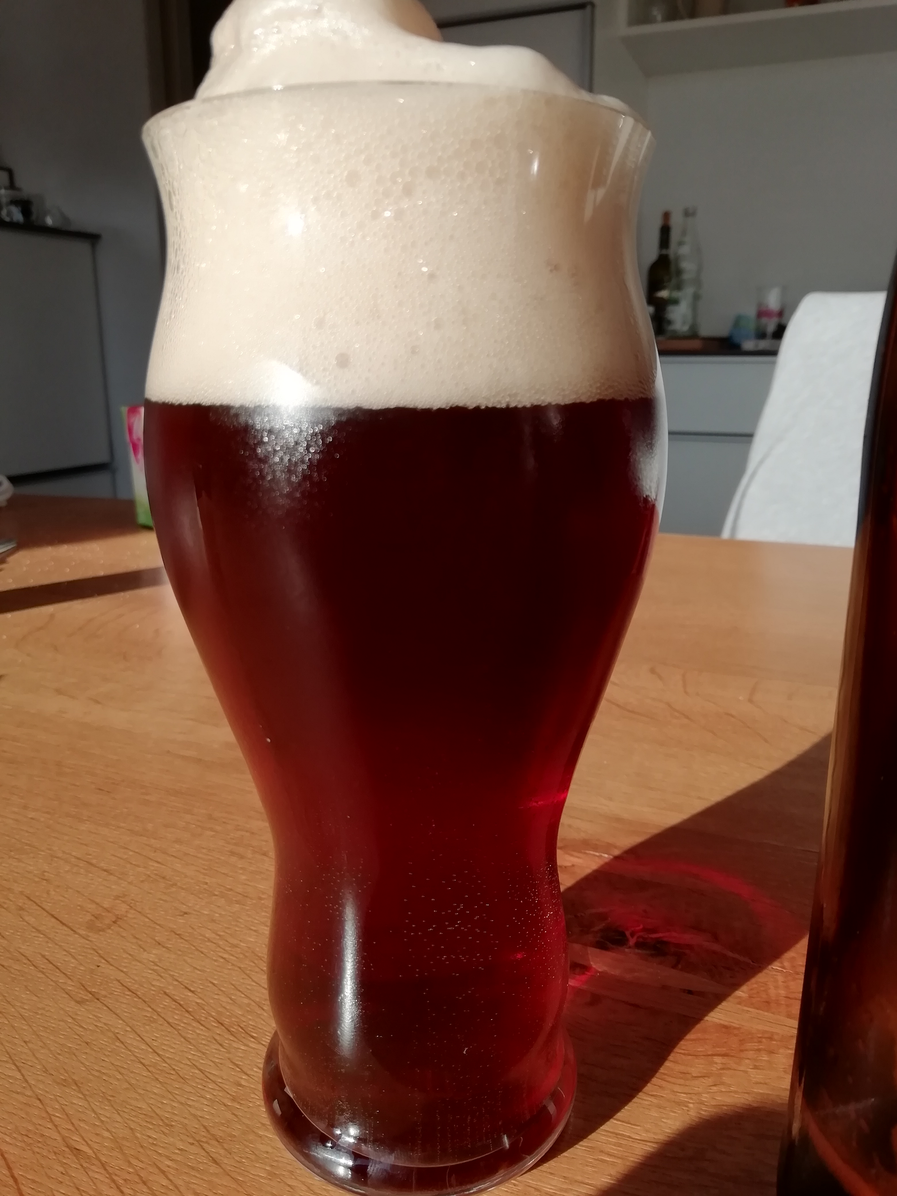Inzwischen ist das Bier ziemlich gut. Aus den Malzen nussig und Trockenobst, von der Hefe Orange und Boskop, gemauerter Schaum (wie aus dem Sahnesprüher) und gut ausbalancierte Bittere. Wobei ich den Green Bullet noch immer etwas als unpassend empfinde. Zu der Kveik hätte ein fruchtiger Hopfen besser gepasst.