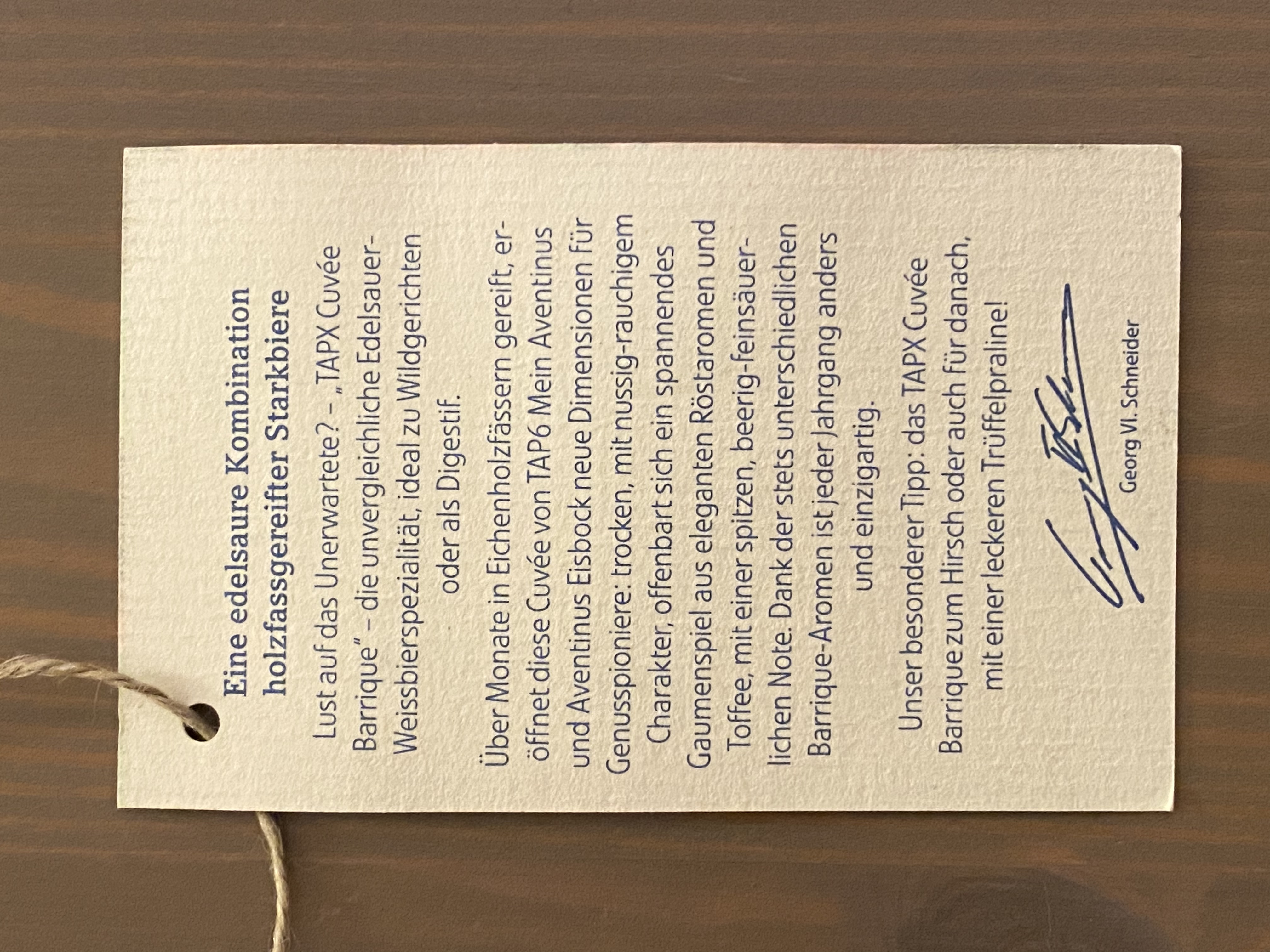 Ein Mitbringsel der Fahrradexpedition durch Bayern. Tap X 2017 von Schneider aus Kelheim. Trocken, nicht schlecht, aber für ein Barrel Aged Bier recht leicht. Ich bilde mir leichte Brettanomyces Noten neben der (recht dezenten) Säure ein. Aber wirklich nur ganz leicht. Vielleicht ein Weinfass mit Brettanomyceston?