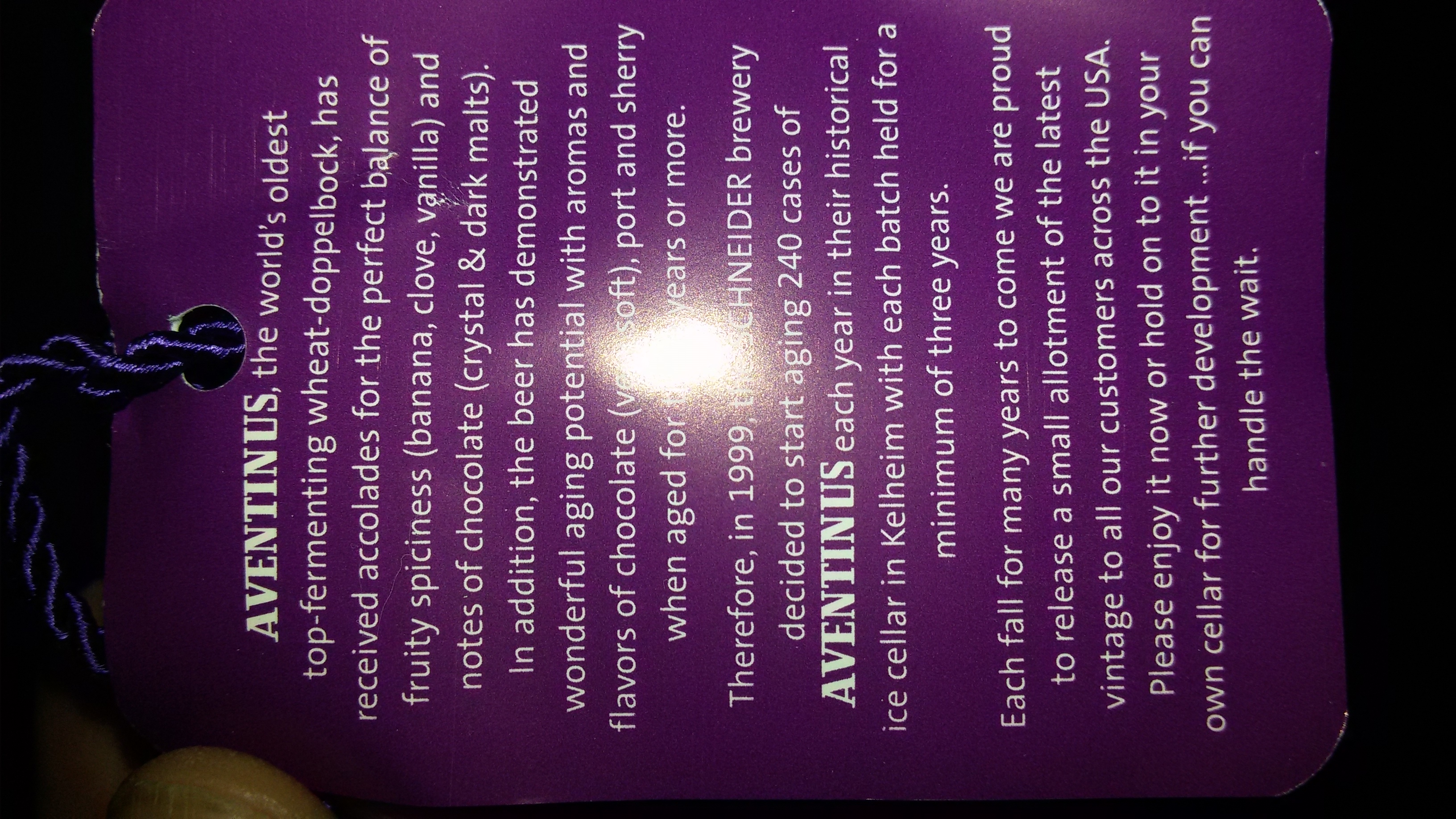 Schneider Aventinus Weizenbock. Sehr dunkel, fast schwarz, trüb, kein Schaumwunder. Nelke, Banane, Pflaumen für die Nase. Budda-mäßiger Körper, süß, ölig, fruchtig, wärmend. Gutes Bier, 12 % Alk. Nicht auszudenken, wie gut das wäre, wenn da noch wahrnehmbarer Hopfen unterwegs wäre.