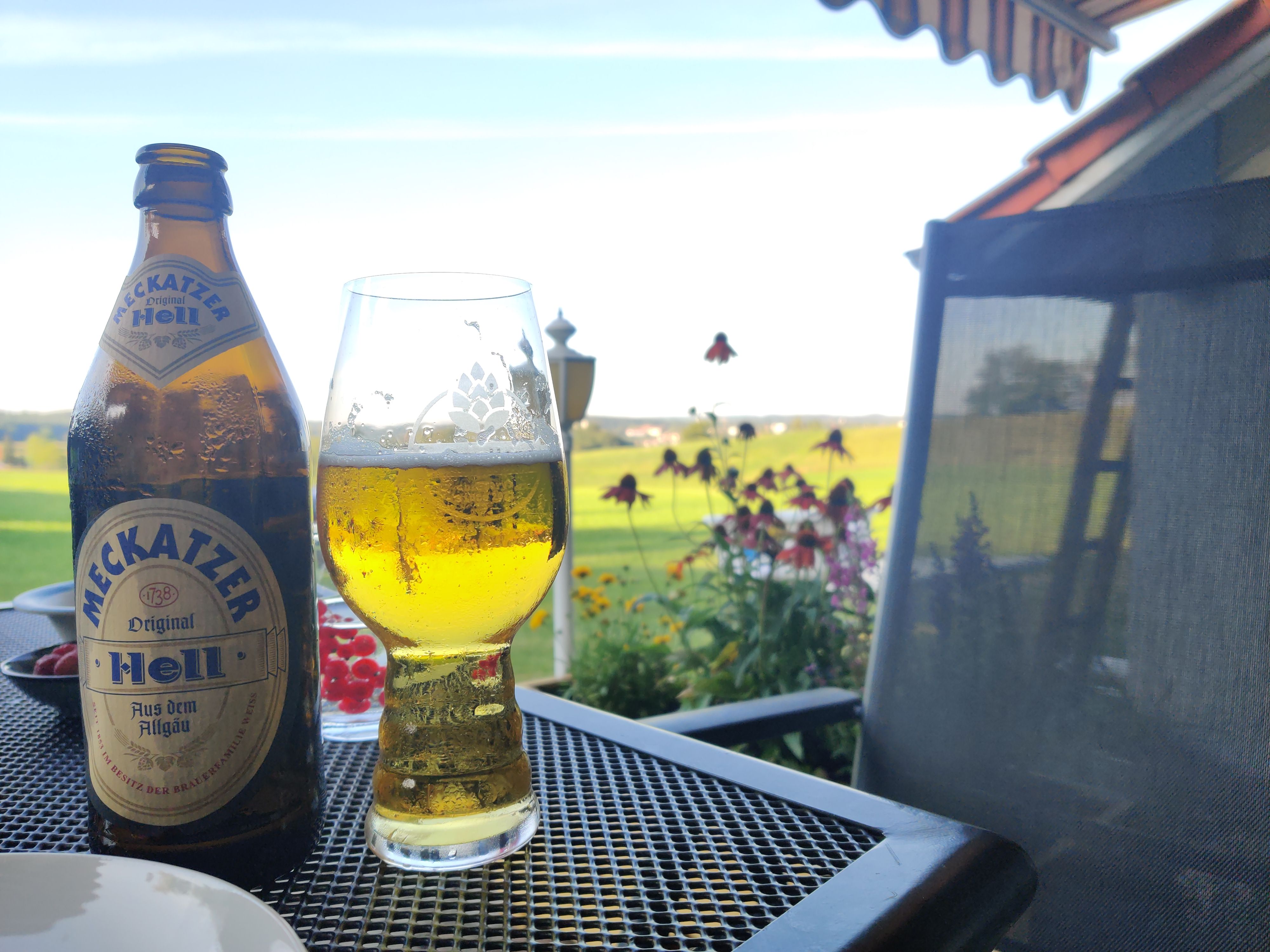 Hab hier ein Meckatzer Helles. Sehr süffig. Etwas leichter als das Weiß-Gold der selben Brauerei. Perfekt nach so nem heißen Tag.