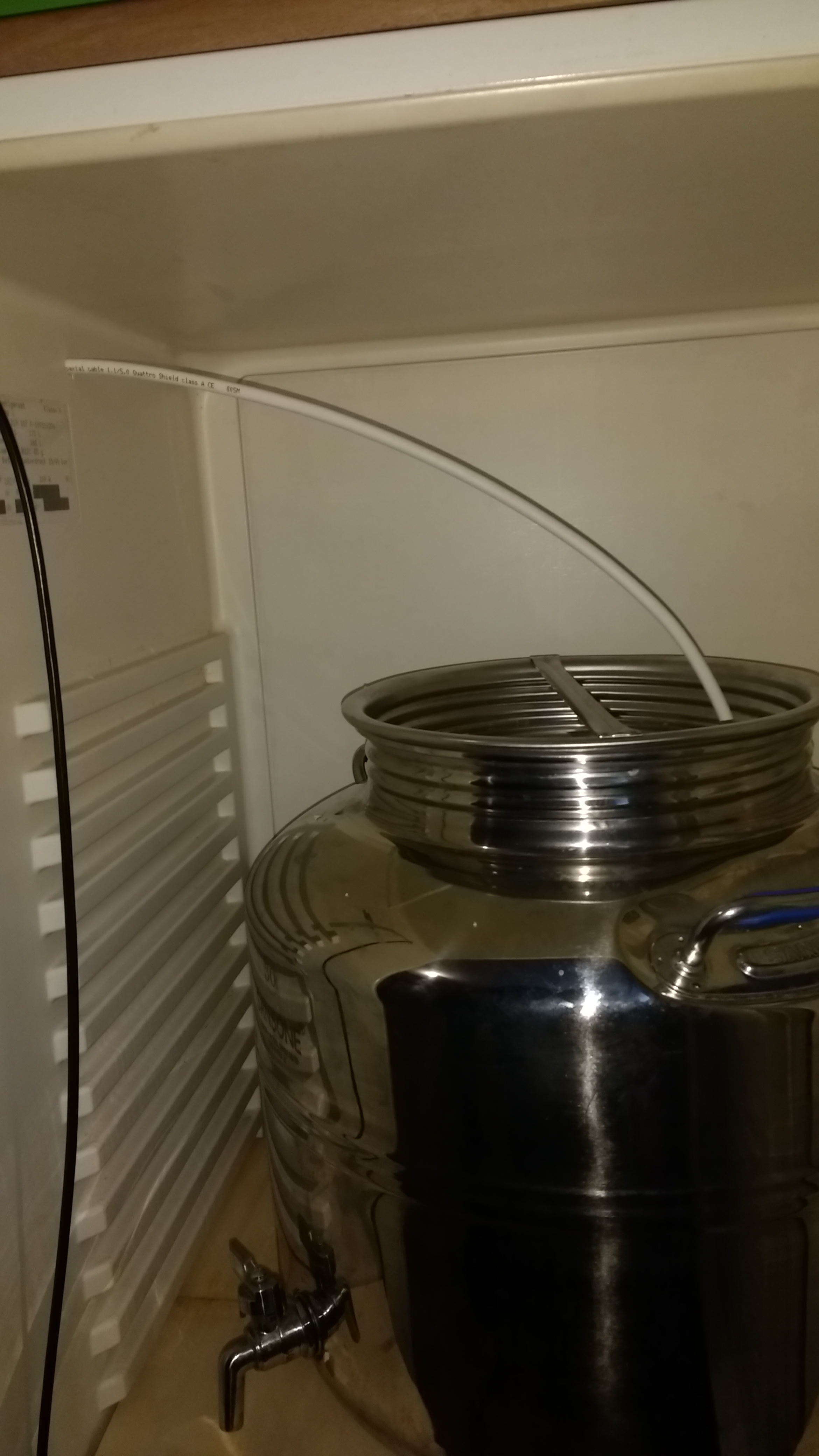 Das eine Ende ragt ins Gärfass, das andere Ende ist nahe am WLAN-Accesspoint.