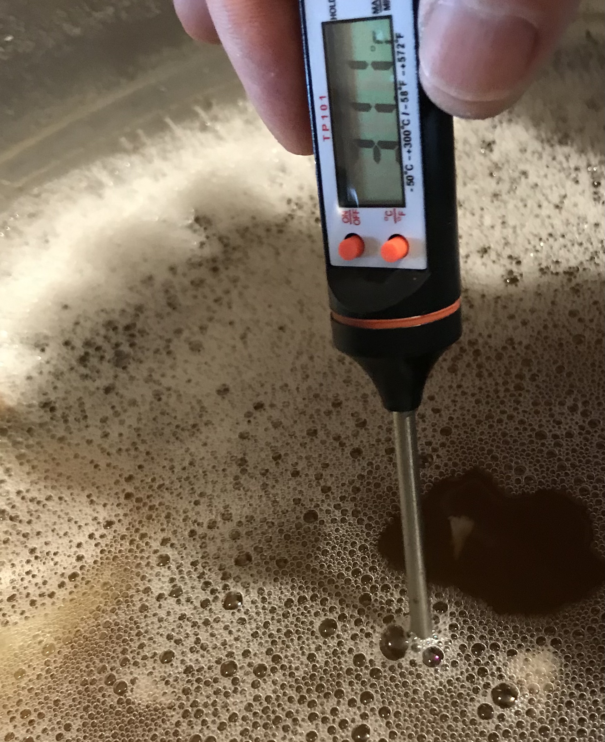 Ich kühle die Würze im Mundschenk mit einer Kühlspirale runter, außerdem hängt meistens noch der Hopspider mit drin. Die Anstelltemperatur war laut MS-Temperaturanzeige relativ schnell erreicht; da ich aber meinen Kühlwasser-Aufbau von Sommer auf Winter umgestellt hatte, hab ich mir nicht groß was dabei gedacht. ALs ich ablassen wollte bin ich mit der Hand gegen den Topf gekommen und war überrascht, dass er eigentlich noch sehr warm war. Nach ein bißchen Rühren schnellte die Temperaturanzeige denn auch auf fast 40° hoch - alle Ablassmaschinen stop - uffa, noch mal Glück gehabt!