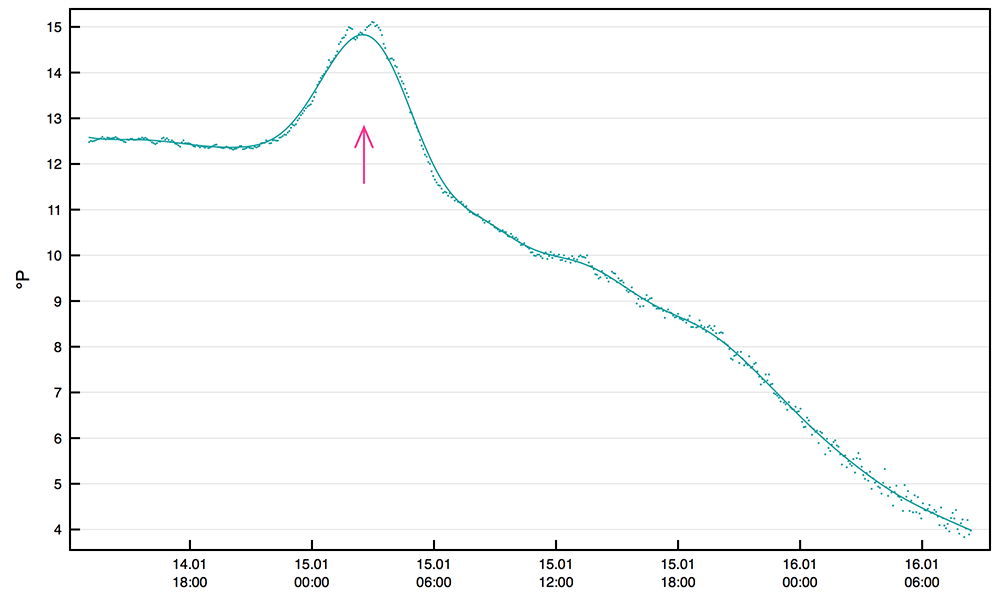 Wenn die Würze leichter wird, zeigt das den laufenden Gärprozess an. Müssten die Kurven dann nicht nach unten ausschlagen statt nach oben?