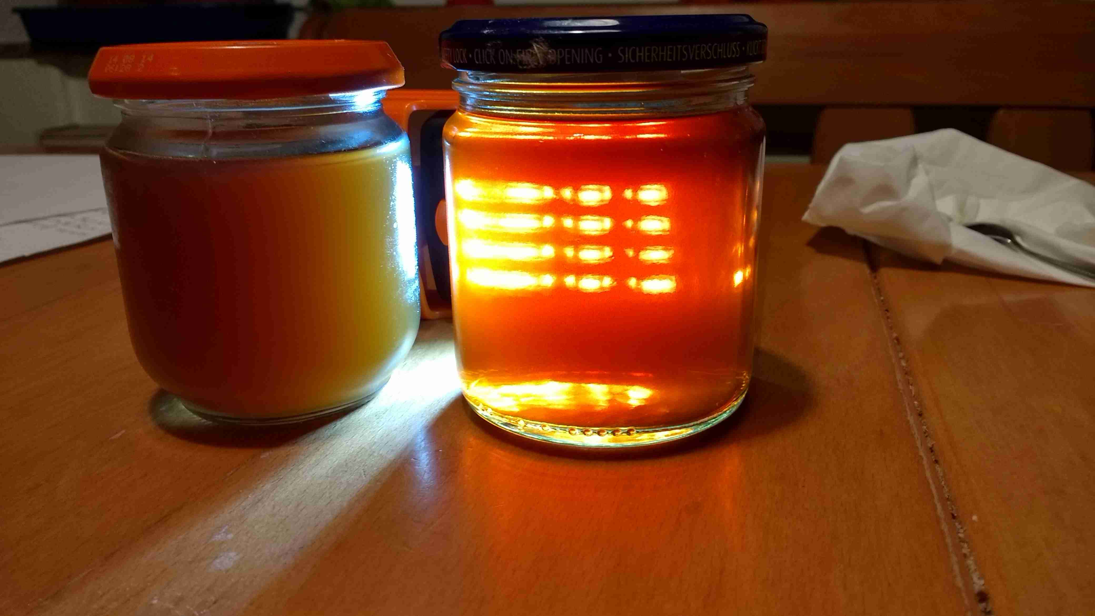 Hier eine Probe nach der Zugabe von etwas Natronlauge . Absolut klar im vergleich zur linken originalprobe.