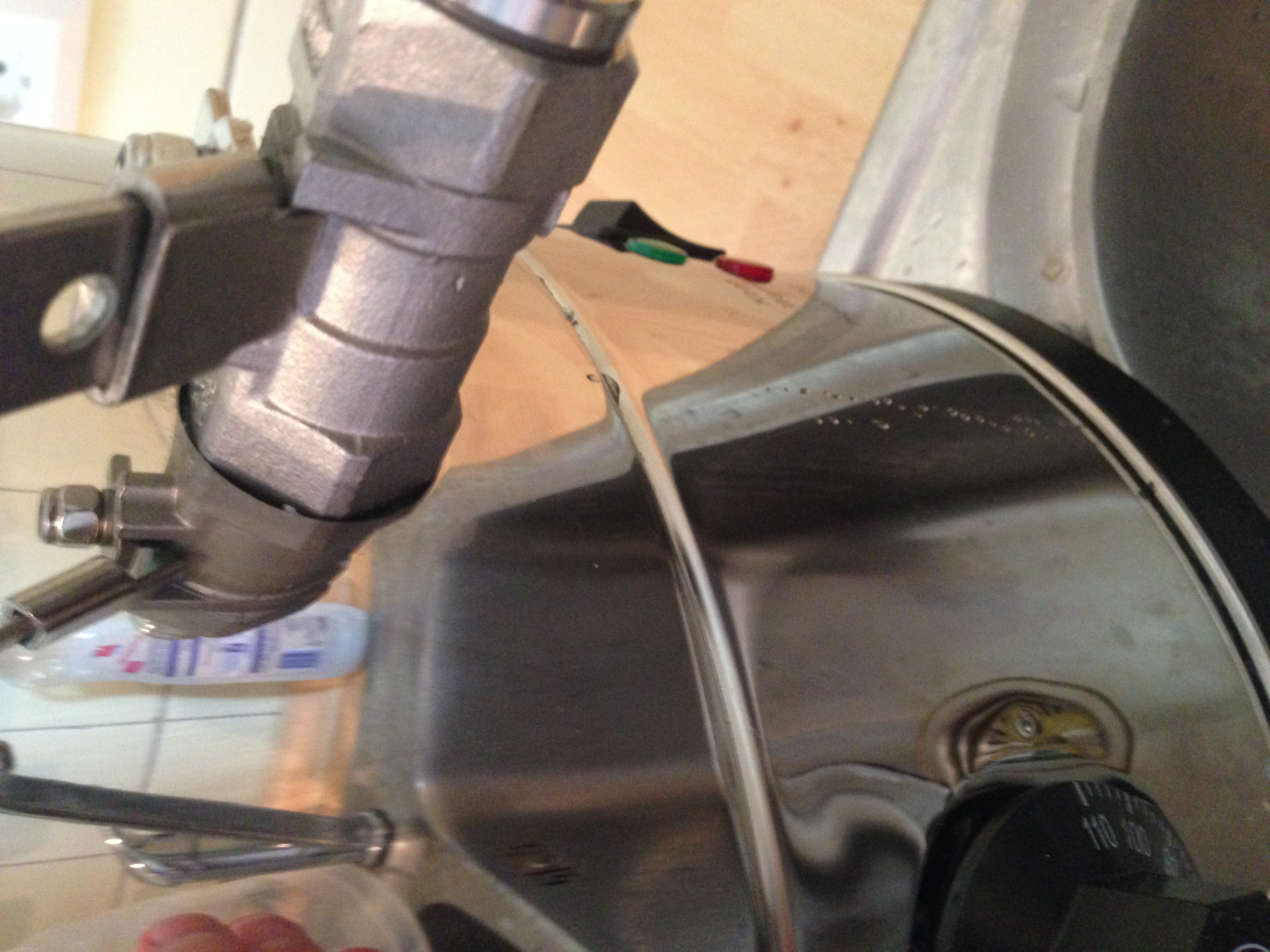 Das Lineal soll dann die Topfwand sein. Innen ist es sehr gut Dicht, der Nippel bietet genügend Dichtfläche. Außen ist bietet der Hahn leider zu wenig Dichfläche. Deshalb habe ich mir eine "Quetschdichtung" aus einem Silikonschlauch gebastelt und diese in den Hahn gelegt. Der Nippel drückt diese dann zusammen und alles ist dicht. Kann man sich hoffentlich vorstellen