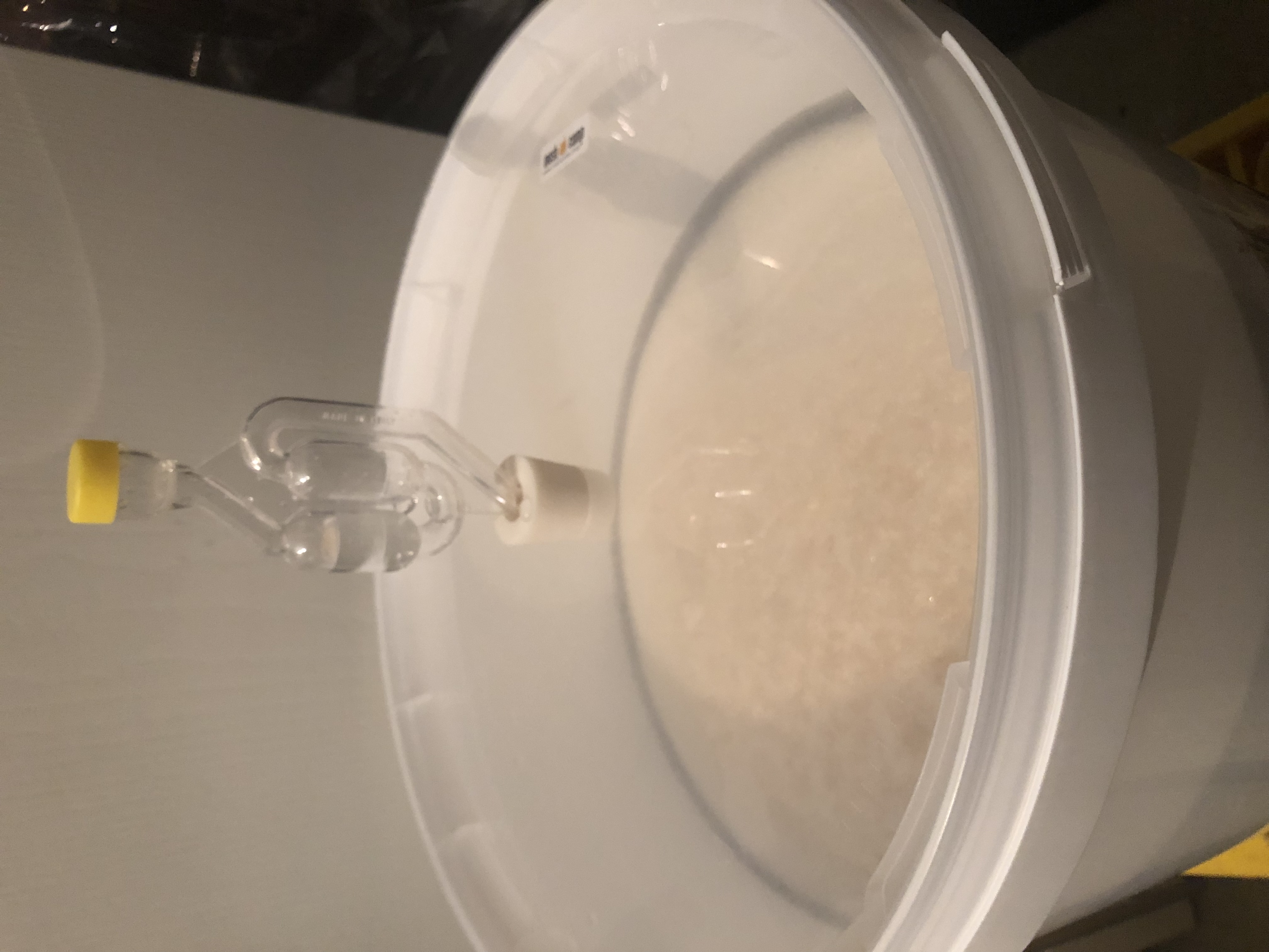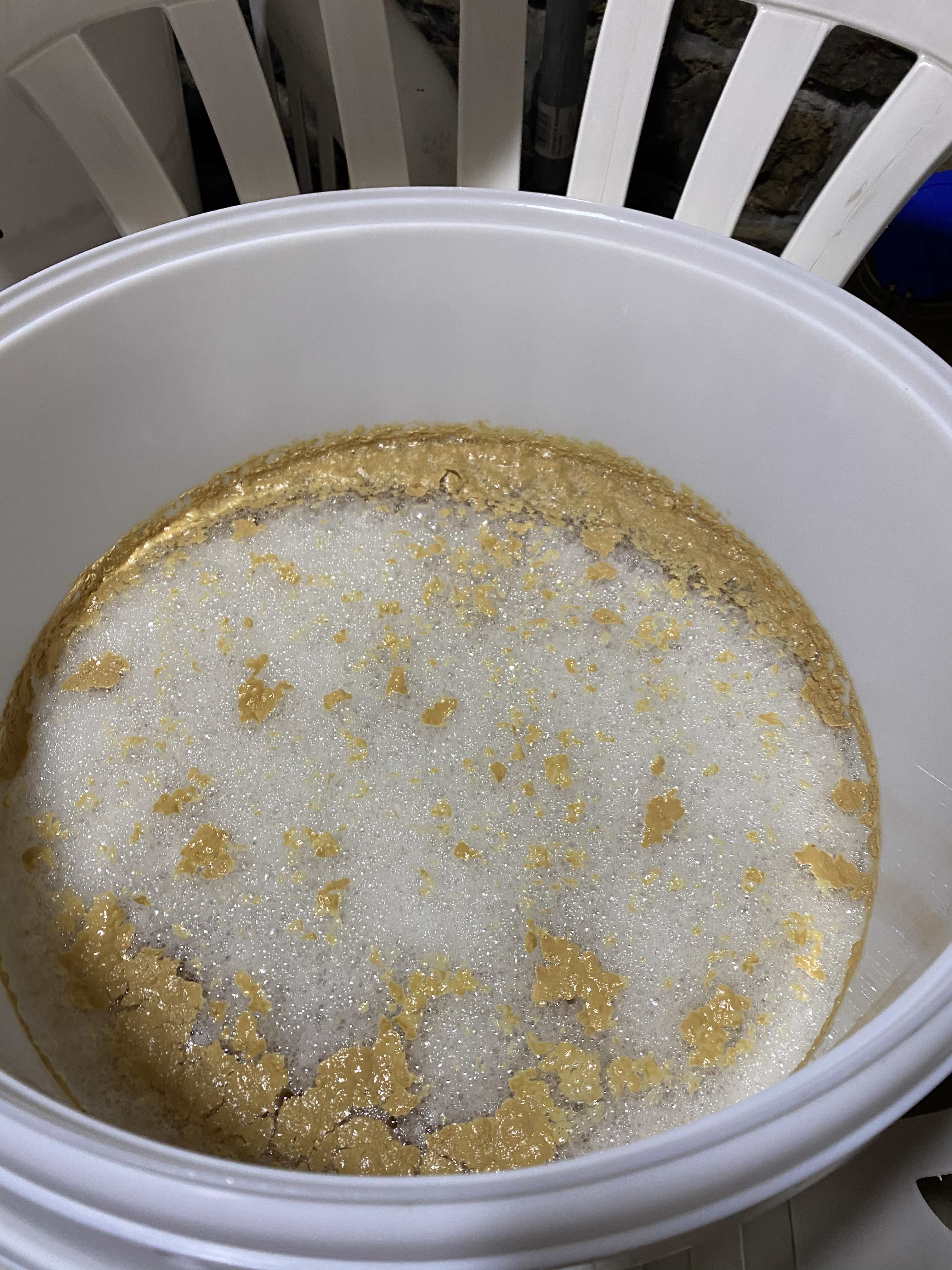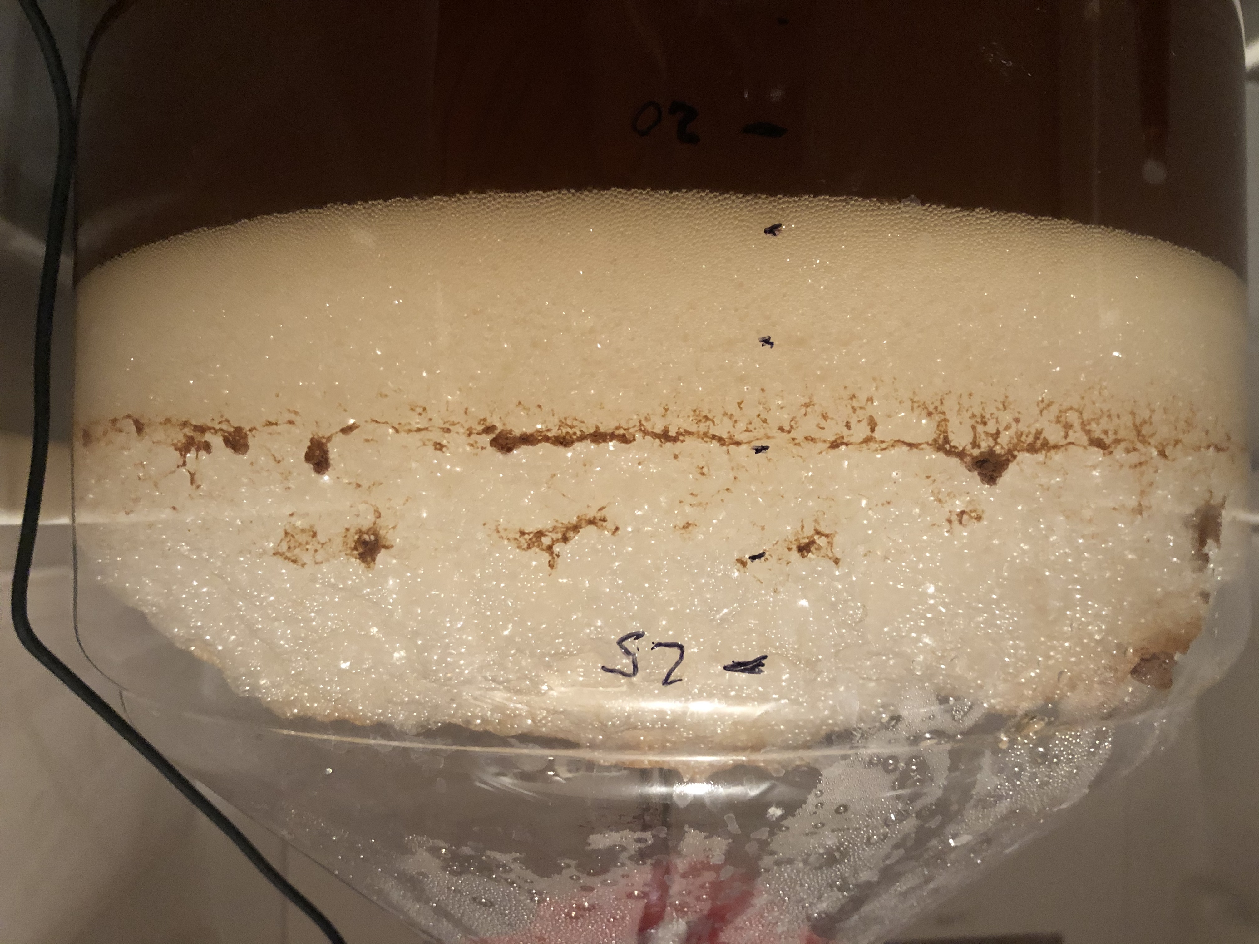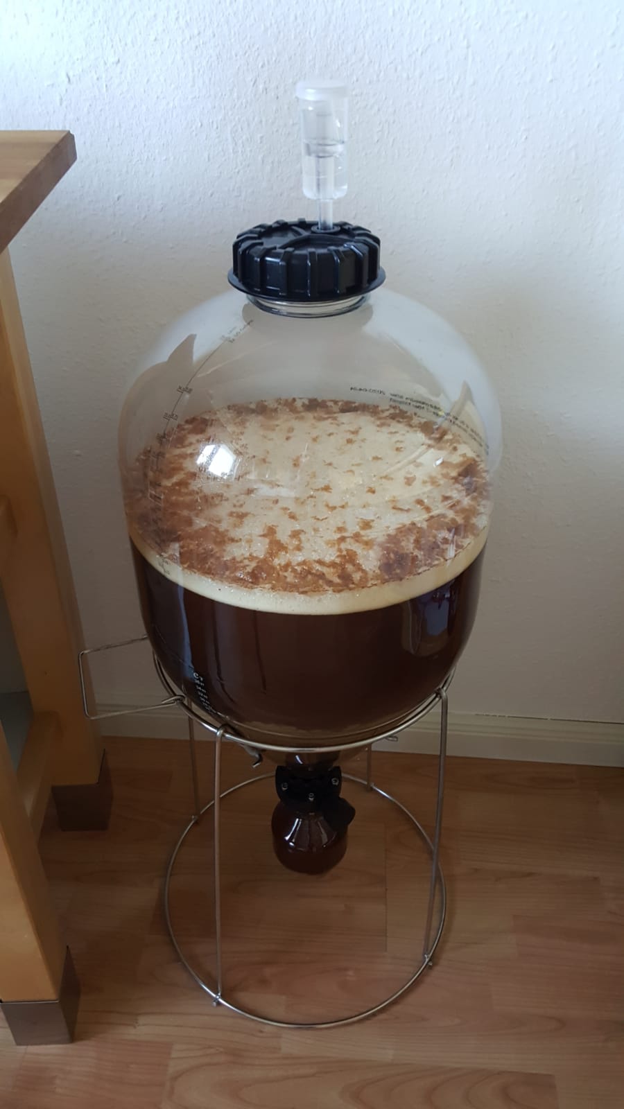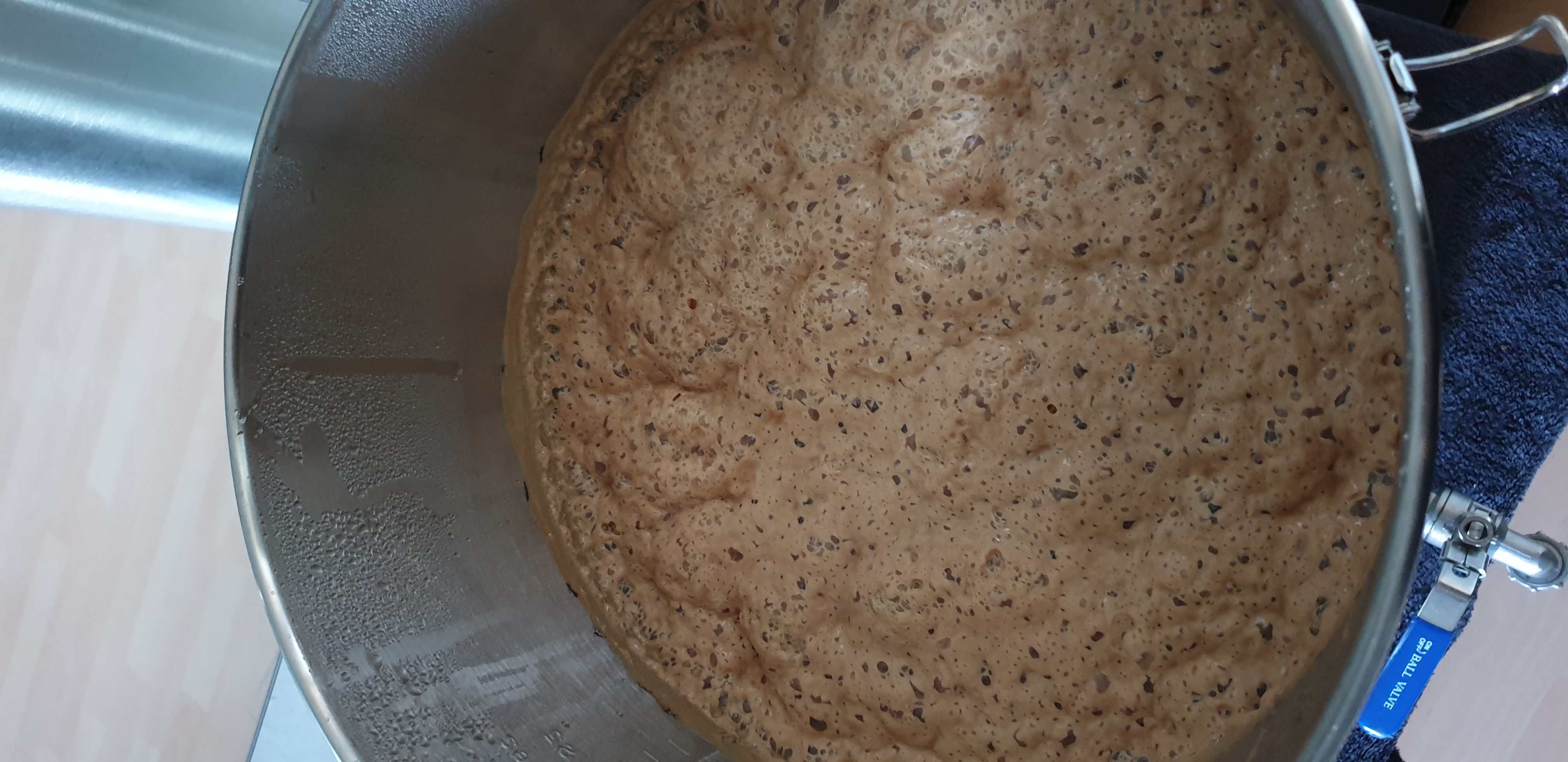 Die Hefe kam nach 3h an und hat jetzt nach 72h von 22 auf 8°P vergoren. Gerade so ausreichend Kopfraum im 60L-Eimer, dass ich ohne Blow-Off-Schlauch auskam (aber musste einmal Gärröhrchen austauschen). Die ersten 48h hab ich es geschafft, ihn unter 19°C zu halten (vor-die-Tür-stellen ist auch eine Kühlmethode), dann auf gut 20° kommen lassen, wo ich ihn jetzt mit Terrarium-Heizmatte halte.
