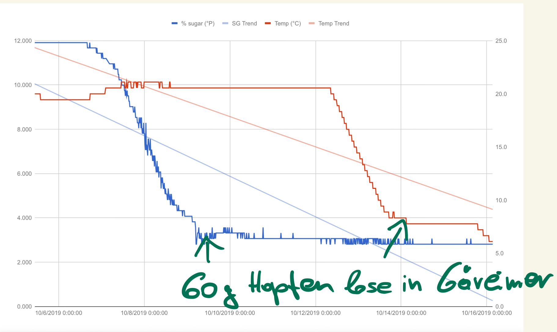 Bei mir gärt gerade ein Mandarina Bavaria Pale Ale - double dry hopped ... ich habe beim letzten Sud einen Split zwischen „nur“ einmal Hopfenstopfen bei Gärtemperatur und dann beim 2. Teil, gleich wie hier zu sehen, bei 8 Grad gemacht. ... ich muss sagen, dass das 2-fach gestopfte Bier viel besser, aber auch ein wenig bitterer war.