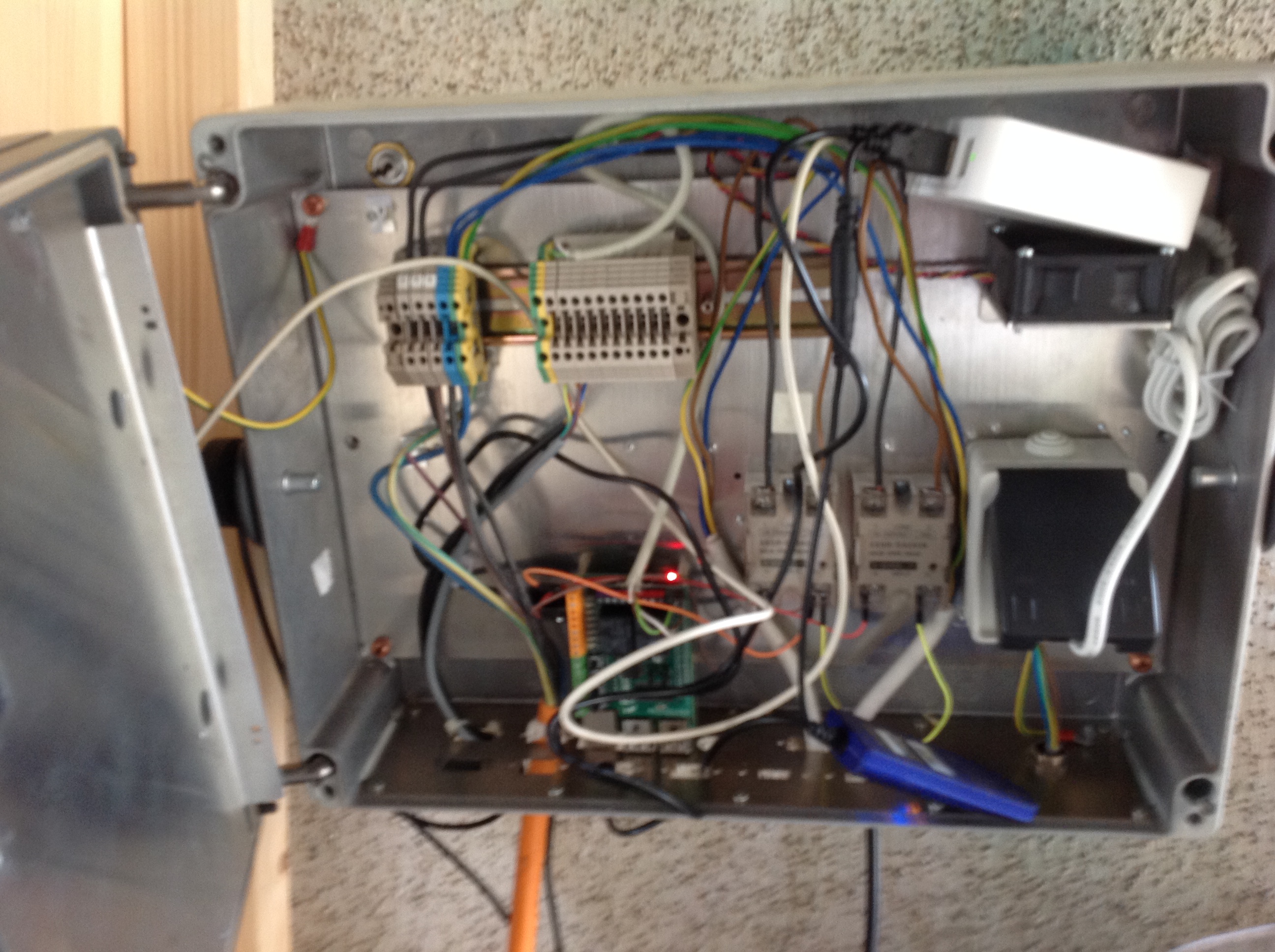 Hier das Foto der Steuerbox von Innen - graues Kabel steuert Pumpe an 3phasen-Relais, braunes Kabel die 3 Relais für die Heizung (hier liegt mit einer entsprechenden Heiz-Logik noch potential die Heizung einzel ein und auszuschalten um diese feiner zu regeln. Die Kabel, wo die Farben nicht passen, wurden an der positiven Schaltungslogik angepasst - Logik bei BM-ist invertiert (mit 2.2 wäre dies auch via Software regelbar). Noch ein schlechtes und nicht finales Foto vom Pi in der Box - aber sollte eigentlich gut vorstellbar sein... und noch die Kabel, welche alles verbinden. Das Gesamtbild kannst Du bei Speidel herunterladen