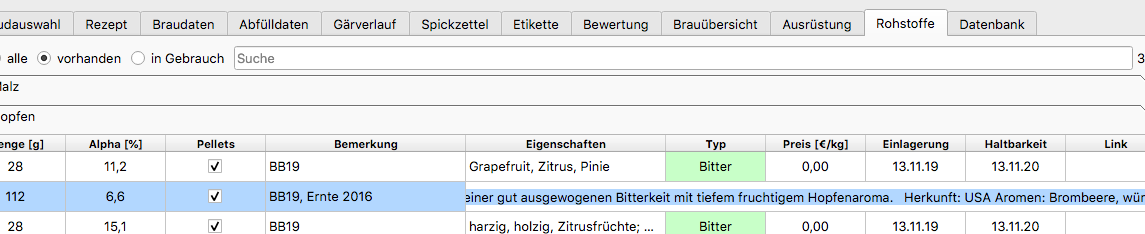 3. Im Reiter Zutaten, Spalte "Bemerkungen" notiere ich den Jahrgang der Ernte (oder hilfsweise das Jahr, in dem ich den Hopfen erhalten habe). Das ist meiner Meinung nach eine eigene Spalte wert.