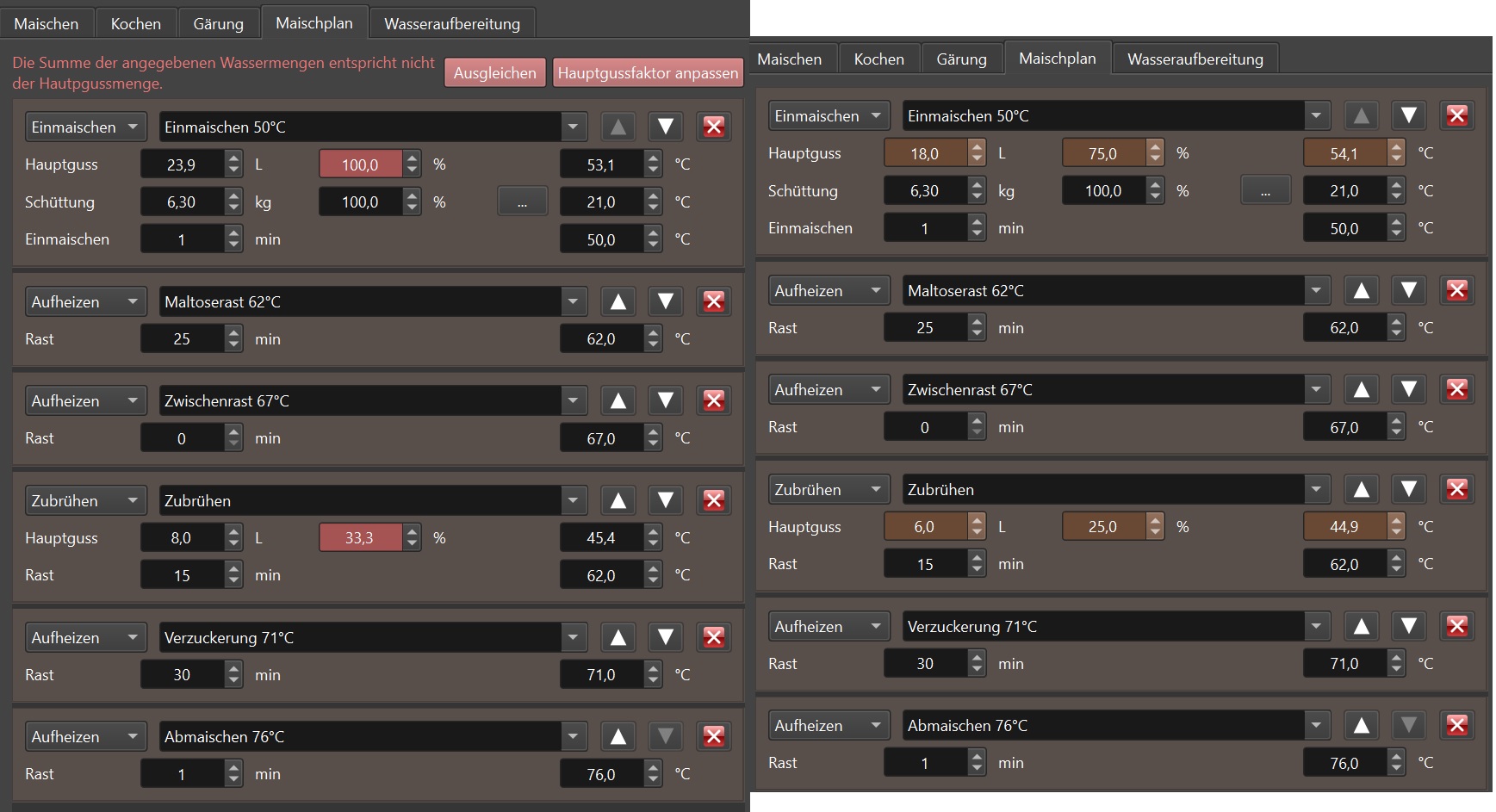 - Gesamtwassermenge (Einmaischen+Zubrühen) muss Hauptgussmenge entsprechen