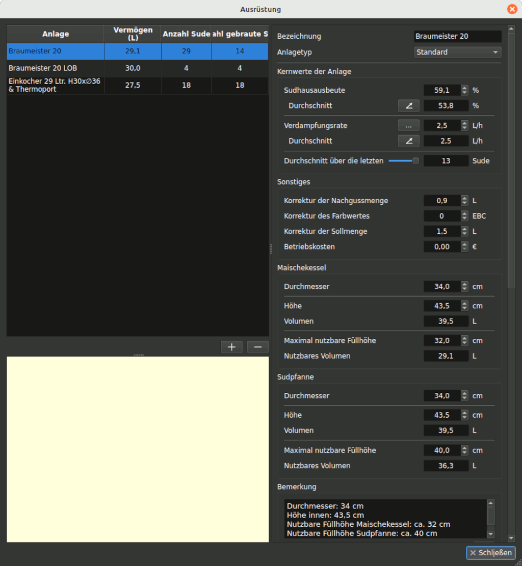 Vorsicht mit dem Auswahlbutton für den Anlagentyp z.B. BM20L, da überschreibst du dir deine Werte für Maischekessel/Sudpfanne.