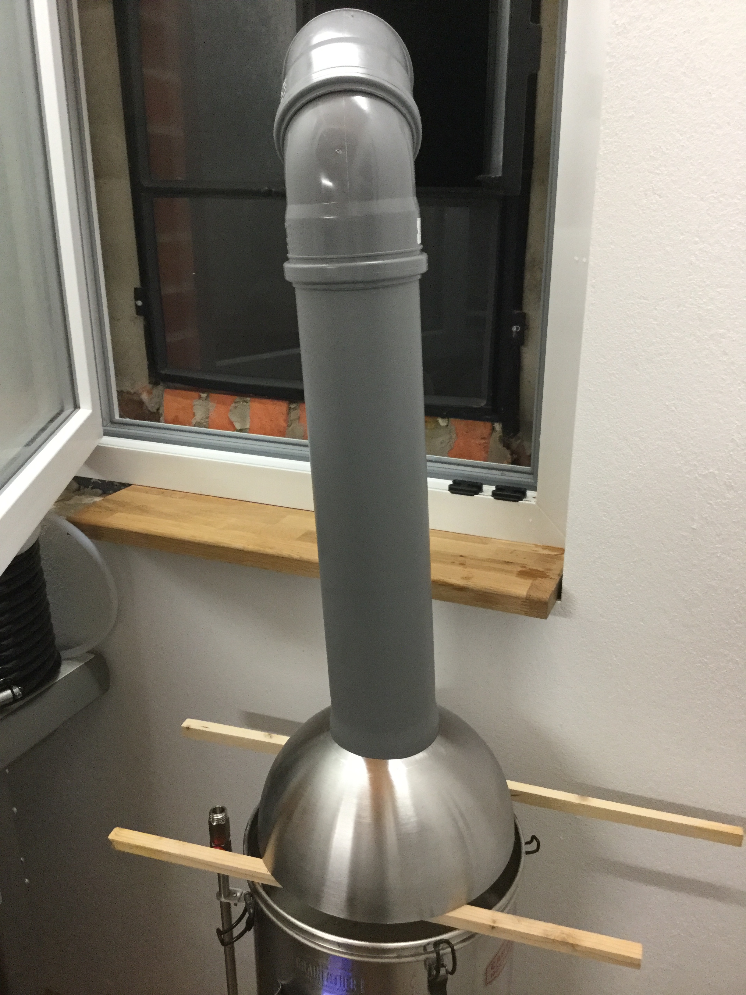 Ich habe meinen alten Einkocher für den Nachguss genutzt. Der Grainfather steht auf dem Boden. Der Einkocher auf der Küchenarbeitsplatte. Das reicht allerdings nicht. Ich hatte mir spontan eine gefährliche und wackelige Konstruktion gebaut.... Es fehlten klappt 15- 20 cm. Aber damit konnte ich dann ganz entspannt den Nachguss auf das Blech laufen lassen.