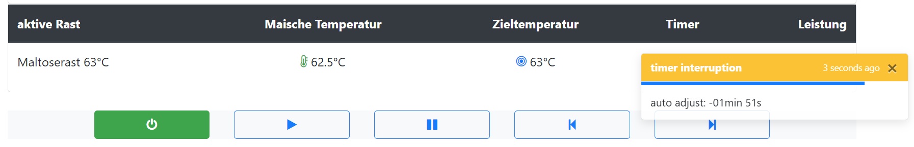 Maischeplan ganz normal gestartet -> der Rast Timer (25min) vom Schritt "Maltoserast 63°C" ist gestartet - > Stecker gezogen -> etwa 2min gewartet und dann den Brautomat wieder eingeschaltet -> WebIf meldet, dass der Rast Timer unterbrochen wurde und der Rast Timer um -1min 51s angepasst wurde.