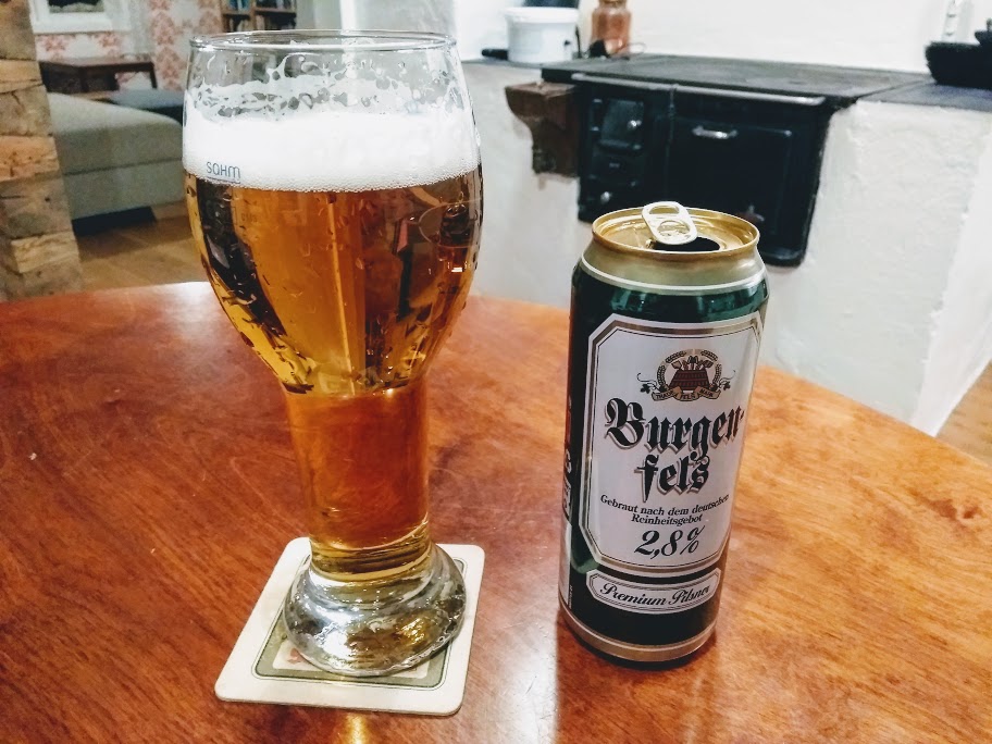 Was ich gerade im Glas habe ist der Beweis, dass man Bier auch ironisch trinken kann. Das "Burgenfels" ist das billigste Industrie-Pils, das man hier bekommt, umgerechnet 45¢, gebraut vom Dänischen Harboe. Ein paar schwedische Kollegen meinten heute, das sei gar nicht schlecht, also kam eins in den Einkaufskorb auf dem Heimweg. Wenn man seine Erwartung an Preis und Stärke anpasst, kann ich ihnen sogar zustimmen; es schmeckt nicht nach nichts.