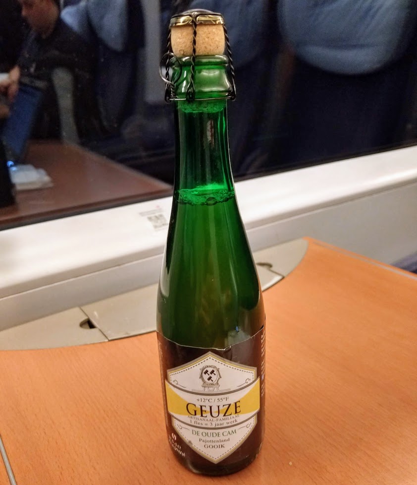 In der Nähe vom Brüsseler Bahnhof gibt es einen Bierladen (Mars Attacks), zu dem ich schon lange einmal wollte: gute internationale Auswahl! Die Geuze von de Cam kannte ich noch nicht, und ich trinke sie gerade im Zug nach Köln (dann Nachtzug nach Wien) wie ein Barbar aus der Flasche. Trotzdem sehr lecker!