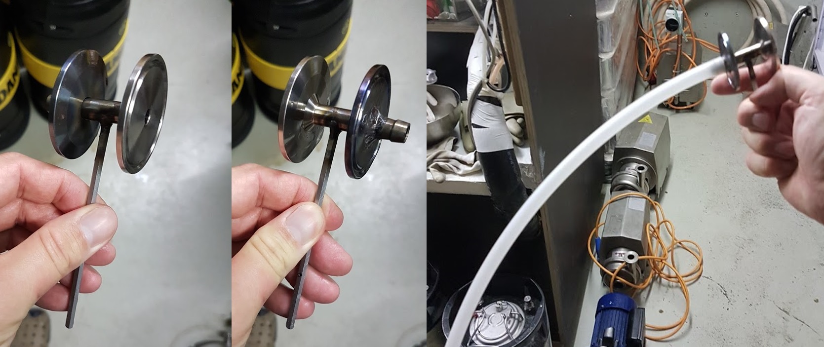 Betreffend dem Thema "Klarbierauslauf" vom letzten Post noch ein Bild als Inspiration. Ich habe schon viele Brauer kennengelernt, die entweder keinen oder einen zu hohen/tiefen Klarbierauslauf hatten. Eine Lösung ist z.B. so ein Adapter (TriClamp mit Schlauchtülle und eine TriClamp-Scheibe, dann unten ein Metallstück fürs Drehen). Mit so einem Adapter kann man nach unten in den Konus/Klöpperboden und das klare Bier abziehen. Falls es doch trübe sein sollte, kann man den Schlauch etwas nach oben drehen. So kann man von jedem Ausgang (z.B. Probehan) das klare Bier bis zum Schluss rausdrücken.