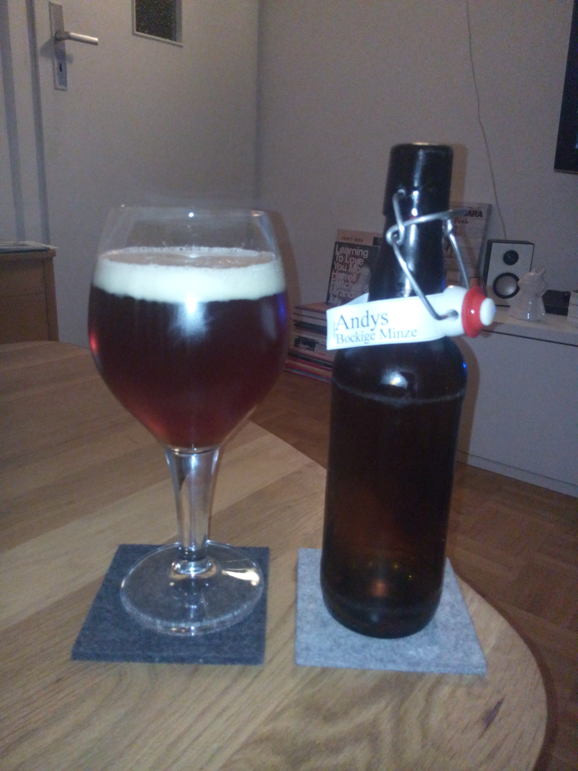 Andys (Brauling) Bockige Minze. Andy war so nett und hat mir bei Camba eine Flasche seines edlen Gebräus mit auf den Weg gegeben und ich hatte gestern endlich die Muße, mich darüber herzumachen. Mir fehlen sowohl die Feinjustierung von Zunge und Nase als auch das Vokabular, um einen umfangreichen Verkostungsbericht abzuliefern, aber kurz und knapp: das Zeuch ist lecker! Mit dem Platz am Fuße des Treppchens hast Du ja auch schon die Bestätigung der Camba-Juroren und -Jurorinnen bekommen, und die sollten sich ja auskennen:). Insgesamt einfach ne runde Sache: Farbe, Schaum, Karbonisierung, Mundgefühl, alles so wie es sein sollte. Und on top immer der leichte, aber schön wahrnehmbare Duft und Geschmack nach Minze. Nach meinem Geschmack hast Du die Dosierung perfekt getroffen, nicht zu viel und nicht zu wenig (ich hoffe, das kann ich in ein paar Wochen auch von meinem Weihnachtsgewürzbier behaupten).