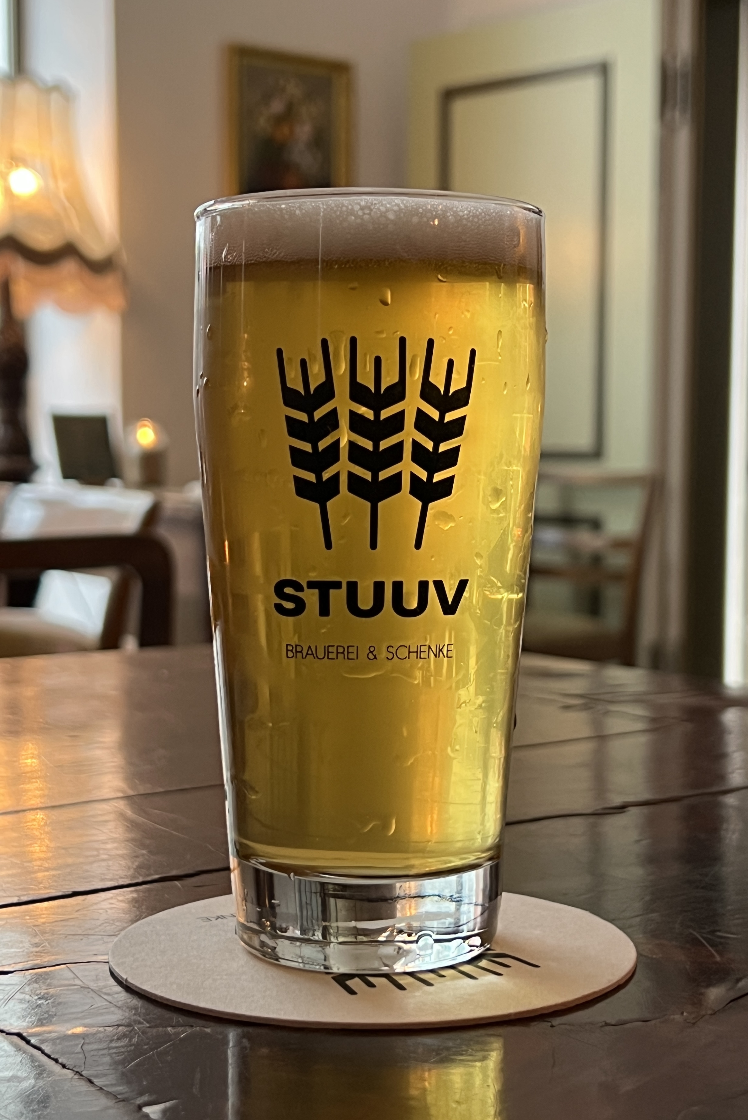 Kühbacher Meistertrunk Hell, sehr gepflegtes Glas mit Bildung von Ringen nach jedem Schluck (für eine Bäckerfiliale wirklich top!), tolle hellgelbe Farbe.