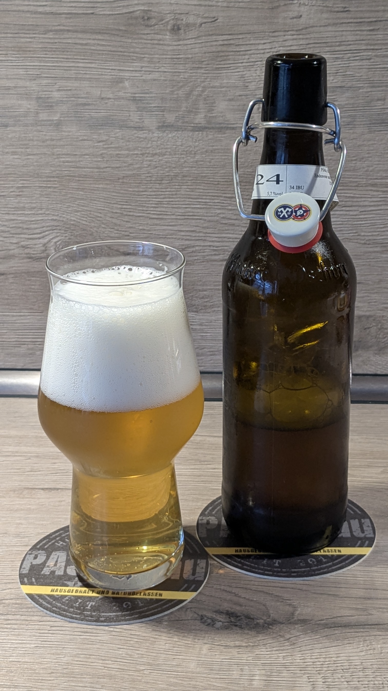 Soweit die graue Theorie. Das Bier ist sehr (!) hell im Glas, mit einer feinen Schaumkrone, die zwar wenig ist, aber stabil (Bild folgt).