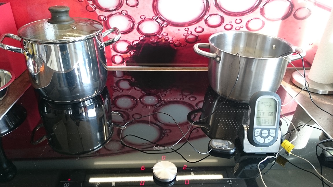 Jeweils 30g Polenta und 30g Cornflakes werden in je 400 ml Wasser bei 67°C eingemaischt, hinzu kommen jeweils 70g Wiener Malz (3 Monate alt, bereits vorgeschrotet gekauft).