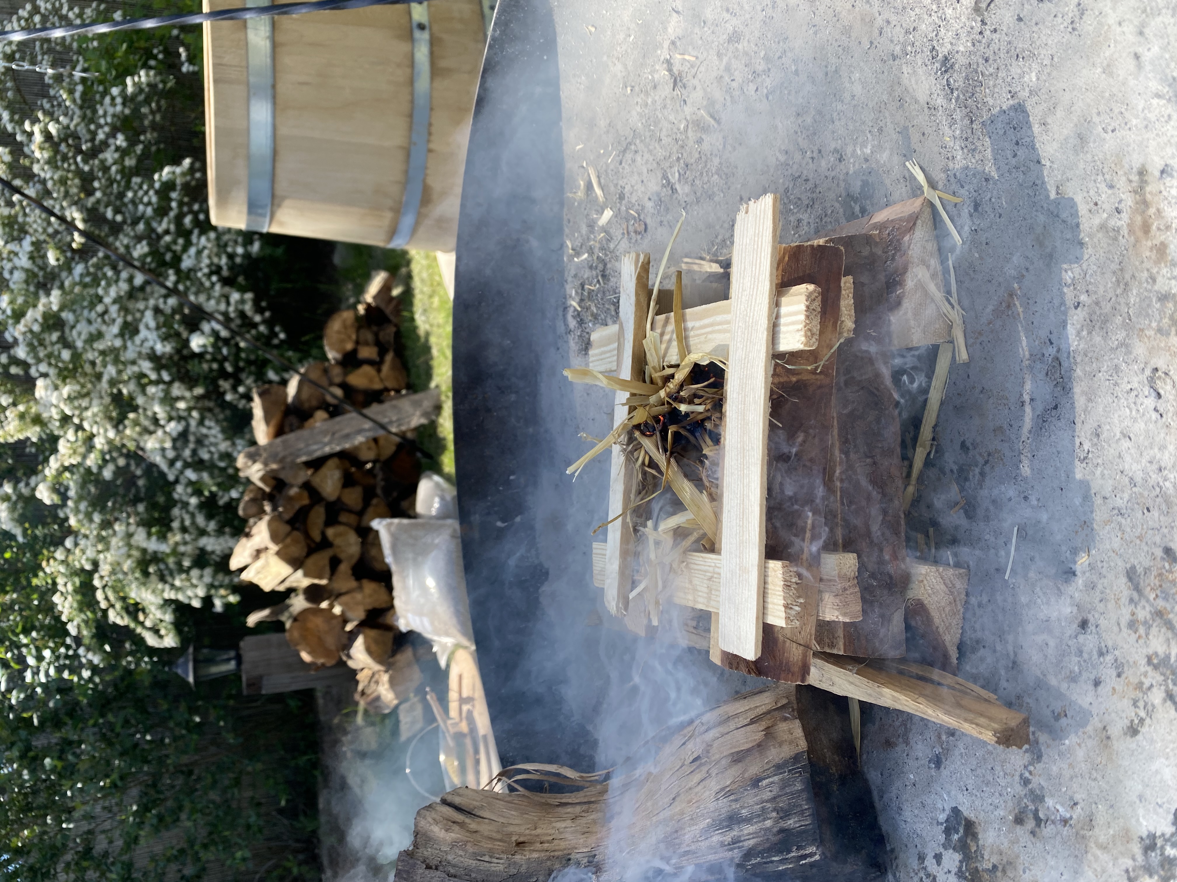 Schon beim Anzünden des Feuers kamen die trockenen Steine (ich habe sie zuvor im Haus aufbewahrt) an den Rand der Feuerstelle, sodass diese schonmal langsam warm werden konnten. Erst nachdem das Feuer aufgebaut war, sich unten eine schöne Glut auf dem Boden verteilt hat und ich die drei Glutnester für die "Steingruppen" (das hat sich echt bewährt !) vorbereitet hatte, kamen die Steine direkt ins Feuer.