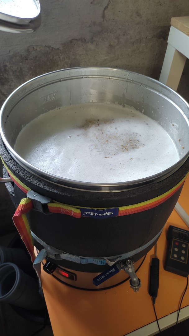 (Ja, Schnitte usw - aber da die Kühlspirale da noch liegt gehe ich davon aus, das ist eine Aufnahmesequenz, und entsprechend keine Hefe, sondern Temperaturausgleich oder ähnliches, was da blubbert)