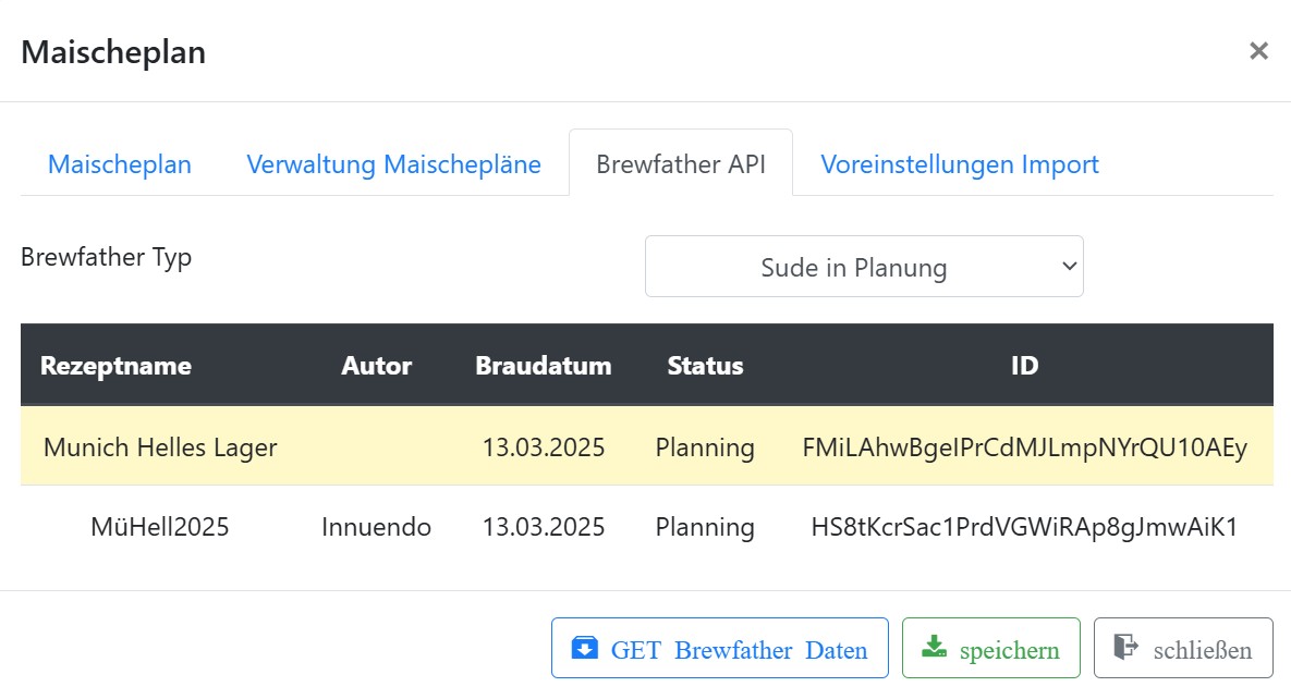 Nach dem Speichern sind Rezepte und Sude aus Brewfather unter Einstellung Maischeplan im Tab Brewfather API verfügbar.