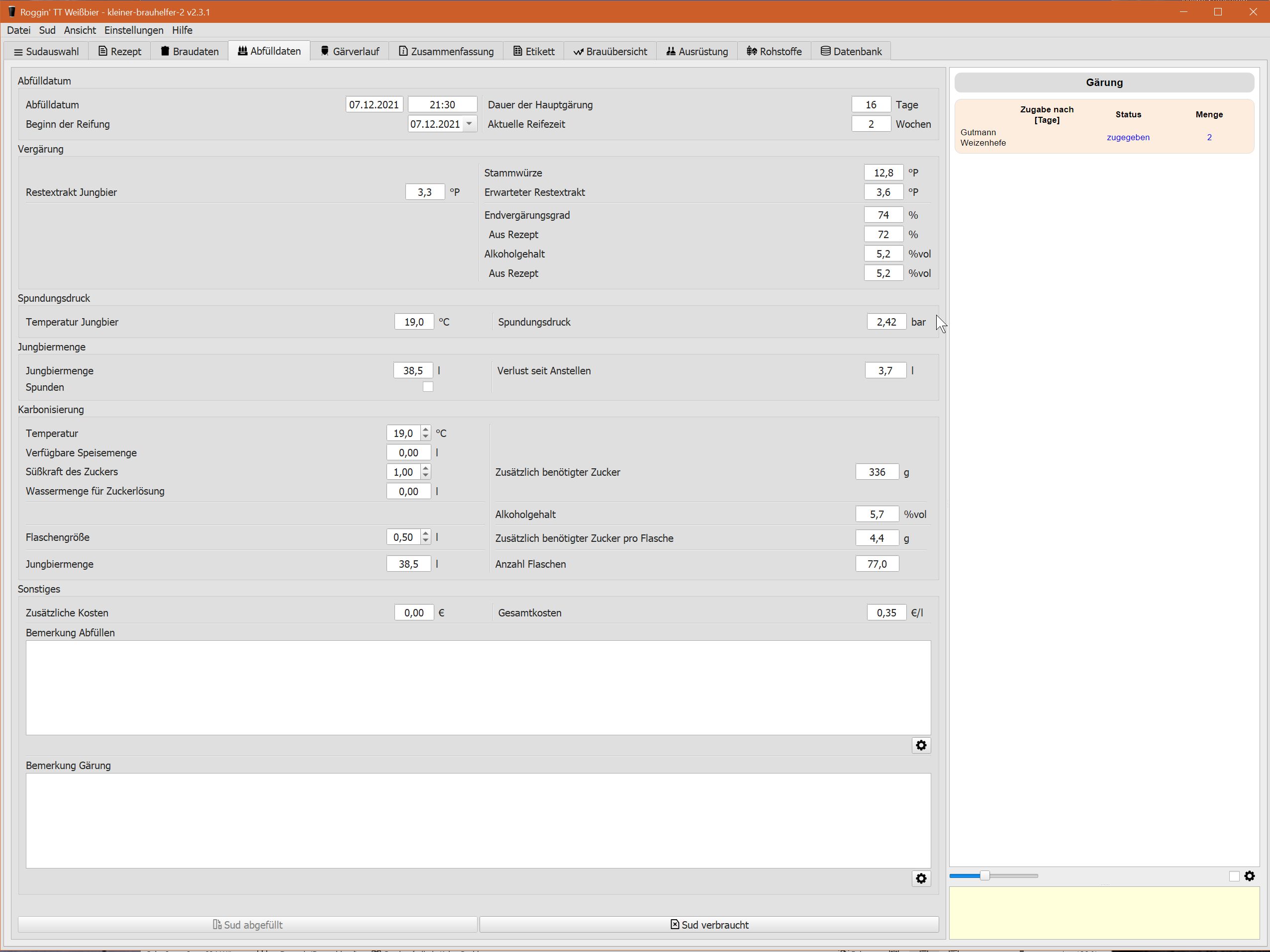 ralfsteck hat geschrieben: Dienstag 14. Dezember 2021, 18:50 Wäre es nicht logischer, im Rezept den Alkoholgehalt nach der "Karbonisierungsgärung" anzuzeigen, das ist ja der Wert5, den ich durch Erhöhen oder Senken der Stammwürze erreichen will, wenn ich ein Rezept erarbeite. Ich weiß, dazu müsste im Reiter "Rezept" ein Schalter rein, ob mit Zucker/Speise oder Zwangskarbonisiert wird. Bei Zucker/Speise kann der kBh ja aus der gewünschten Karbonisierung den Zuwachs ausrechnen (macht er ja auch auf der Seite "Abfülldaten) und diesen zum aktuell angezeigten Wert hinzuaddieren.