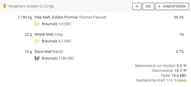 Wirklich eingeschränkt hat mich, dass ich beim "Black Malt" mit 1300 EBC, was im Rezept für die Bierfarbe zuständig ist, nur in 10g Schritten eingeben kann. Die Schüttung (bzw in diesem Fall wohl eher Prise) vom Black Malt müsste hier in der Mitte bei 16g liegen. Gehe ich auf 10g wird das Bier ne ganze ecke heller, bei 20g ne ganze Ecke dunkler. Bei einem 11,5 L Sud und solch einem Farbmalz macht das ordentlich was aus.