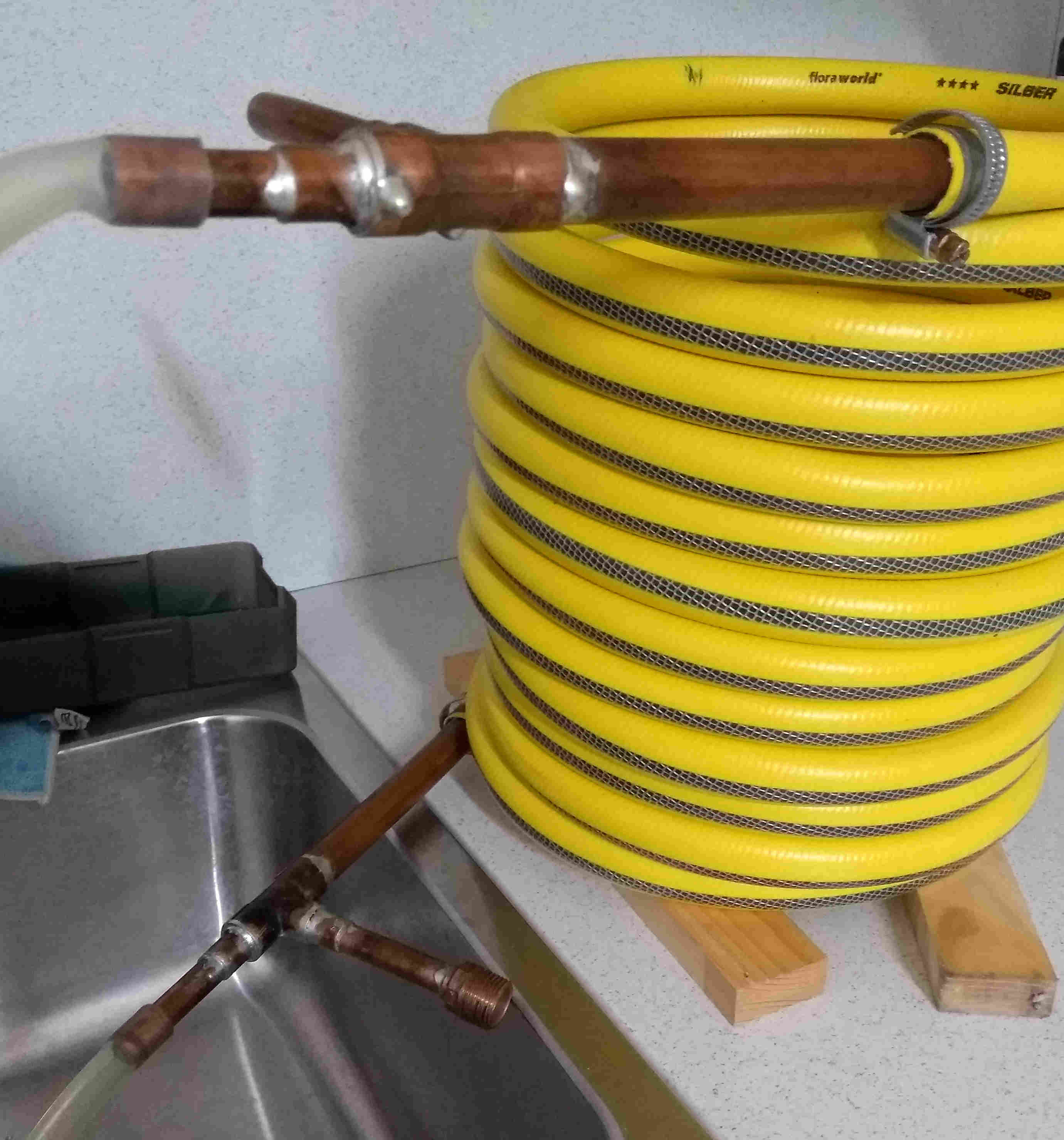 So einen Gartenschlauch habe ich mir auch zusammengelötet. Kühlleistung ist hervorragend: 20 Liter in 10 Minuten von 80°C auf 16°C. Der schafft sicherlich auch 5°C, wenn man ihn mit Eiswasser füttert.Grundsätzlich war ich mit der Leistung (Verhaltnis Wassermenge/Kühleffekt) sehr zufrieden. Bin aber auf Kühlspirale (für "in den Topf") und Gegenstromkühler (Spirale in Gartenschlauch) umgestiegen, da diese sich einfach gründlicher und besser reinigen lassen.