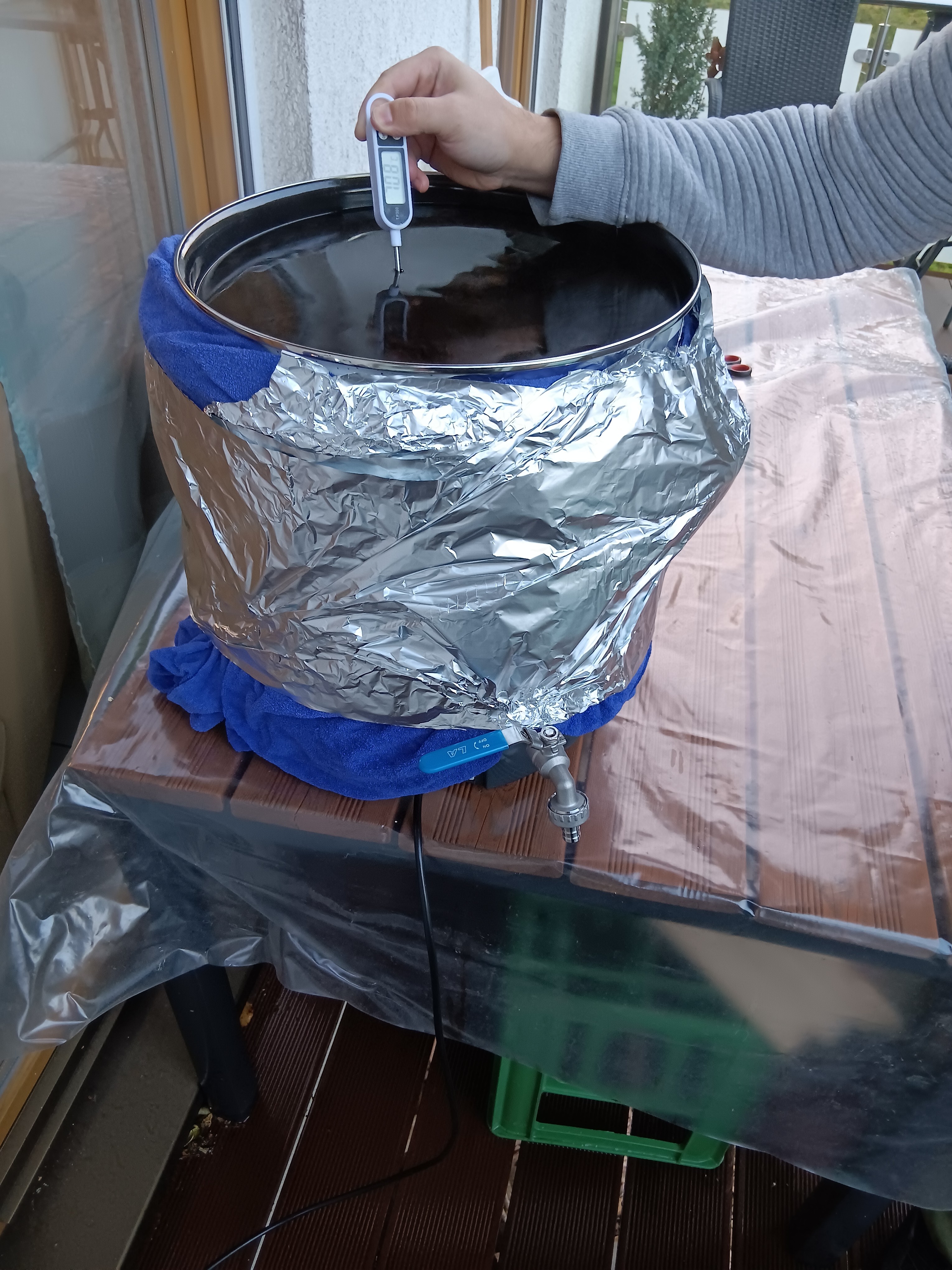 Zwischenzeitlich habe ich aus Verzweiflung den Einkocher mit einer alten Decke und Alufolie isoliert.