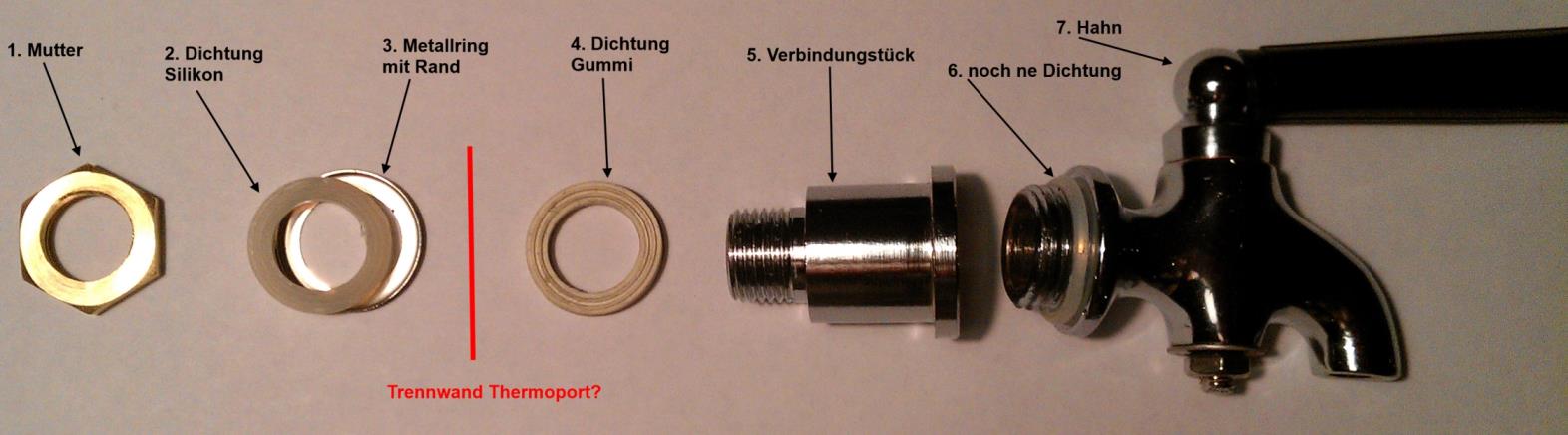 Die restlichen Teile sind an deinem Hahn am Thermoport schon dran. Die wo bei deinem verlinkten komplett Hahn dran sind sind zu gruß für das Themoport Loch.