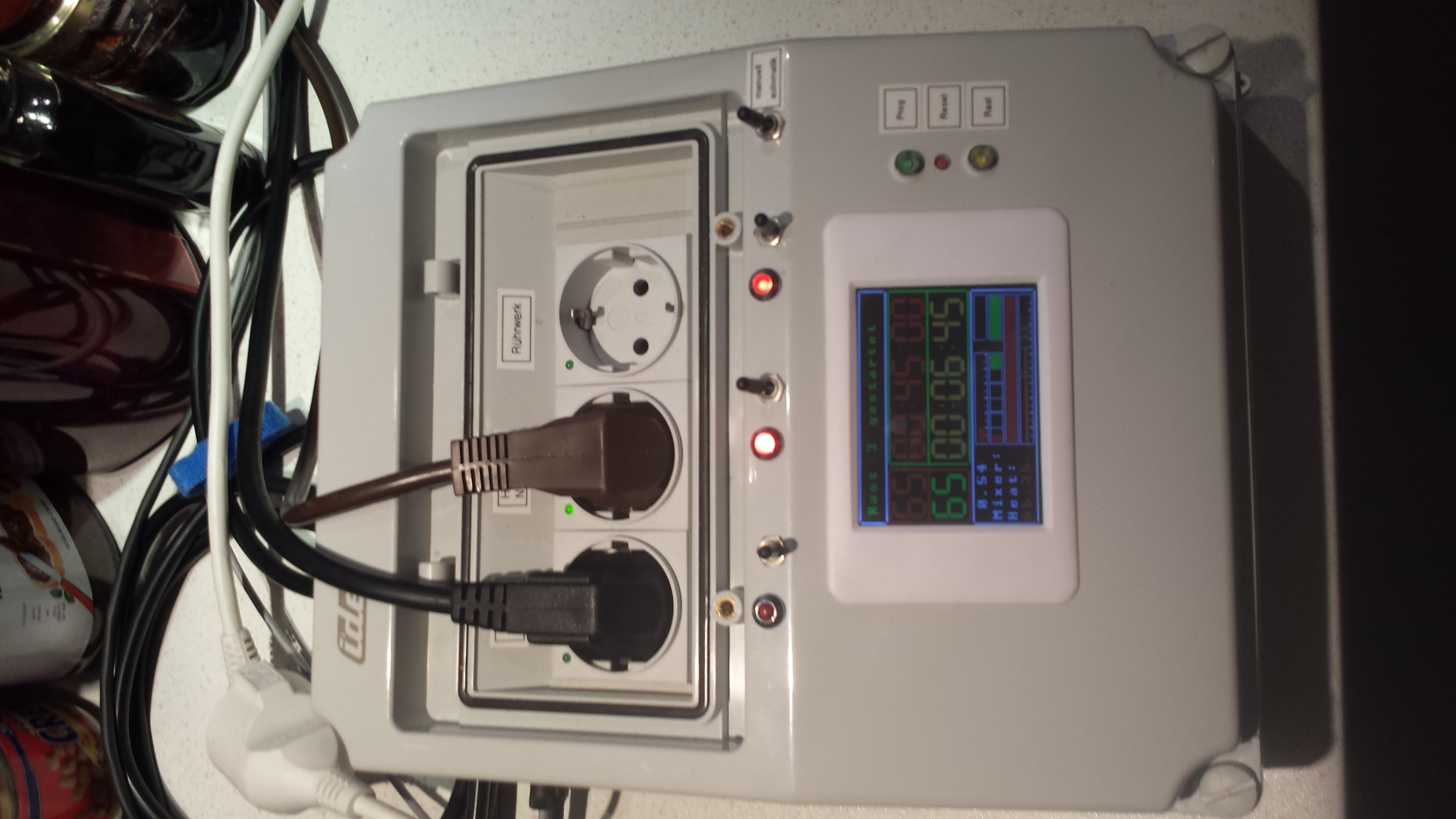 Was die Hardware betrifft, so sind noch ein paar Lüfter drin, 3 SSR mit Kühlkörper, sowie zwei Netzteile für Arduino und Rührwerk, ein FI, 2x230V Steckdosen permanent, 3x230V Steckdosen geschaltet über SSR auf Hutschiene, Fühleranschluss, 2x12V Buchsen (1 Permanent, 1 geschaltet), 1 USB Buchse zum Programmieren des Arduino und 4 Kippschalter mit denen von Auto auf Manuell umgeschaltet werden kann so dass Heizungen und Rührwerk auch manuell zu schalten sind. Dann noch 2 Status LEDS und ein Reset Taster.